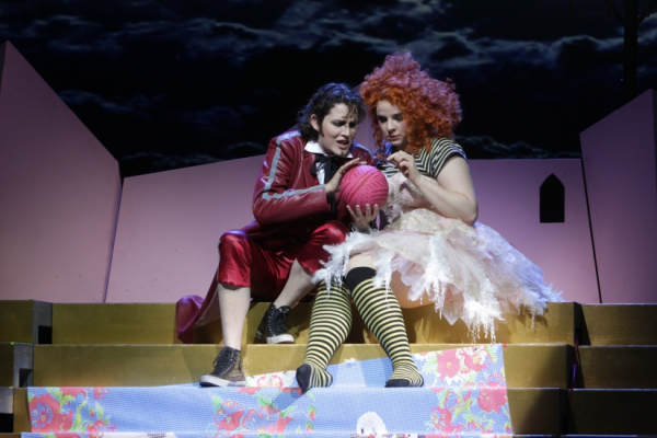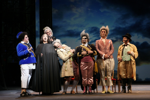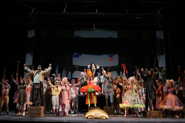 Das Inszenierungsteam des Regisseurs Matthias Davids erlag nicht der Versuchung, das märchenhafte Geschehen gewaltsam zu aktualisieren – die Parallelen zu den Diktaturen dieser Welt oder dem unberechenbaren Präsidenten einer Weltmacht sind da deutlich genug. Zu den hierzulande bekannten Problemen blieb es bei Andeutungen, die zu Lacherfolgen führten: So war eine der ersten Amtshandlungen von König Karotte das Zeigen der Merkel-Raute, oder es gab eine spitze Bemerkung zum Zustand der aktuellen Regierung. Im Übrigen machten die mit verblüffend einfachen Mitteln bewirkten, überaus raschen Wechsel der Szenen staunen (Bühne: Mathias Fischer-Dieskau – Licht: Sascha Zauner), in denen geradezu eine Kostümorgie ablief. Susanne Hubrich hatte den Fundus gründlich geplündert, um die vielen Choristen und Statisten immer wieder unterschiedlich einzukleiden, was bis zu dem tollen Auftritt von acht Statisten in vollständiger Ritterrüstung führte. Damit sind wir bei dem Agieren auf der Bühne: Wie es dem Regisseur und der Choreographin Kati Farkas gelungen ist, das Ensemble und den Chor zu den flotten Tanz-Bewegungen bei Can-Can, Walzer und anderem zu animieren, das machte richtig Spaß anzusehen, zumal alle mit unbändiger Spielfreude bei der Sache waren. Sicher, manche der zum Verstehen des Inhalts wohl erforderlichen Sprechtexte zogen sich ein bisschen hin, aber insgesamt war es ein rundum gelungener Musiktheater-Spaß.