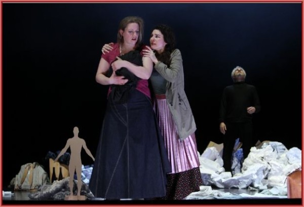 Dazwischen die Lot-Handlung: zwei Engel betreten die Stadt Sodom, um die Gerechten zu erkennen, der hedonistischen Bevölkerung Sodoms in ihren goldfarbenen Kostümen (Gabriele Rupprecht) stellt sich Lot vor die Fremden, die in ihrer ärmlichen Erscheinung nicht in die Wohlstandsbevölkerung Aufnahme finden soll. Lot ist sogar bereit seine Töchter und sich selbst der Menge hinzugeben ,um dem Gebot des Gastrechts genüge zu tun, was Lots Familie schockiert, hier rupfen die patriarchalischen Züge des Alten Testaments doch arg an unserem heutigen denken; so ist Lots Frau mitsamt Töchtern schockiert, noch mehr als man Wohlstand und Sicherheit verlassen muß, um die Vernichtung zu überleben. Lots Frau geht lieber mit Sodom unter, wie sich Lot und seine Töchter schließlich nach der finalen Katastrophe entschließen ethische Grundsätze zum Fortbestand der Menschheit hintanzustellen. Hier schleicht sich als Logikfehler ein, daß Lot und Töchter als die letzten überlebenden Menschen betrachten. Frank Hilbrich findet in seiner Inszenierung in der Bühne Volker Thieles stringente Bilder und erzählt die Handlung verständlich nach, ohne bei den Aktualitäten zu sehr auf das Tagesgeschehen einzugehen, streift dabei sogar ironische Ansätze, so der Papierkorb Gottes für die Menschenproben.