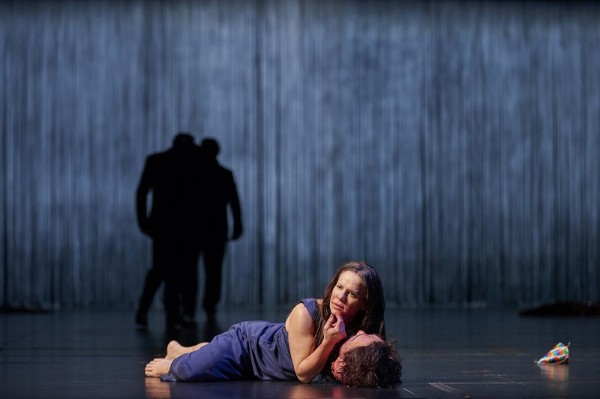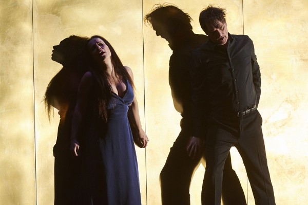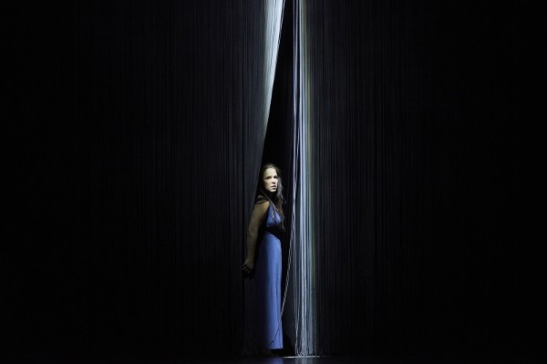 Nahezu ohne Bühnenaufbauten kommt die Produktion von Ingo Kerkhof aus, lediglich zwei Vorhänge bestimmen das Bild – einer ist ein beweglicher Fadenvorhang, der den „Draußen“ und das „Drinnen“ voneinander trennt, das andere einer, der – einmal heruntergelassen – wie eine goldene Wand erscheint (Bühne: Anne Neuser). An dieser Wand und in diesem dunklen Rundum spielt das geniale Licht von Elana Siberski mit den Schatten der Agierenden und geht weit über das Schaffen verschiedener Stimmungen hinaus. Vielmehr gelingt ihr durch die Schattenwelt eine zusätzlich Ebene, die Kerkhof gut einzusetzen weiß. Im Hier und Heute verortet er das Geschehen (die moderne Abendgarderobe stammt von Inge Medert) und setzt natürlich Salome ins Zentrum seiner Betrachtungen – das aber in doppeltem Wortsinn. Denn Salome wird ständig von allen betrachtet, Naraboth und der Page beobachten vom Rang aus den Mond und das Erscheinen der Prinzessin, die das Fest des Stiefvaters verlässt, um nicht ständig von allen lüstern angestarrt zu werden.
