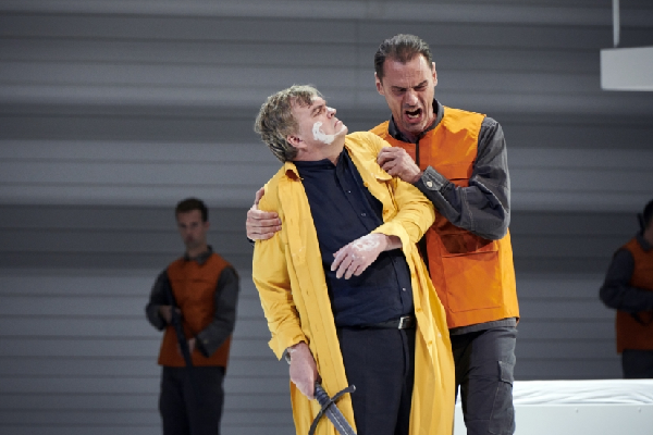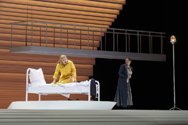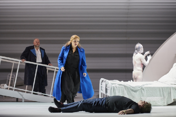 Und die Regie? Zunächst einmal ist positiv festzustellen, dass der erfahrene Regisseur Stephen Langridge nicht gegen die Musik inszeniert hat – und das ist heute leider nicht selbstverständlich. Conor Murphy, verantwortlich für Bühne und Kostüm, hatte als Umgebung für eines der berühmtesten Liebespaare der Kulturgeschichte eher abstrakte Installationen als Bühnenbilder erstellt, in denen meist eine kalte, sterile Atmosphäre vorherrschte. Da halfen auch die großen, den Bühnenraum nach hinten begrenzenden, farblich changierenden Lamellen wenig (Licht: Susanne Reinhardt). In allen Aufzügen waren drei unterschiedlich arrangierte Elemente zu sehen, ein kleines ovales Podest, eine große Röhre und eine Brücke. Zusätzlich hatte sich das Inszenierungsteam für die Verwendung des Butoh-Tanzes entschieden, als laut Programmheft „eine Art Dämmerebene, die asymmetrische Bilder von Sehnsucht und Leiden erzeugt“. Butoh-Tanz, laut Wikipedia eigentlich: Ankoku Butō („Tanz der Finsternis“), ist ein Tanztheater ohne feste Form, das nach dem Zweiten Weltkrieg in Japan entstand. In der Choreografie von Tadashi Endo traten nun dieser und Nora Otte fast nackt und gänzlich weiß geschminkt im Verlauf des Abends immer wieder auf, auch während des Vorspiels und vor allem im 3. Aufzug, hier wohl als eine Art alter ego von Tristan und Isolde – richtig erkennbar war das nicht. Dabei bewegten sie sich in extrem verlangsamtem Zeitlupentempo und mit befremdlichen Verrenkungen; so liegt der männliche Tänzer zeitweise in Tristans Krankenbett, was diesem die Möglichkeit gibt, sich voll auf die schwierigen Passagen im Fieberwahn zu konzentrieren. Die Verbindung des handlungsarmen Geschehens mit Butoh-Tanz ist sicher Geschmacksache, ich fand sie überflüssig und manchmal sogar störend.
