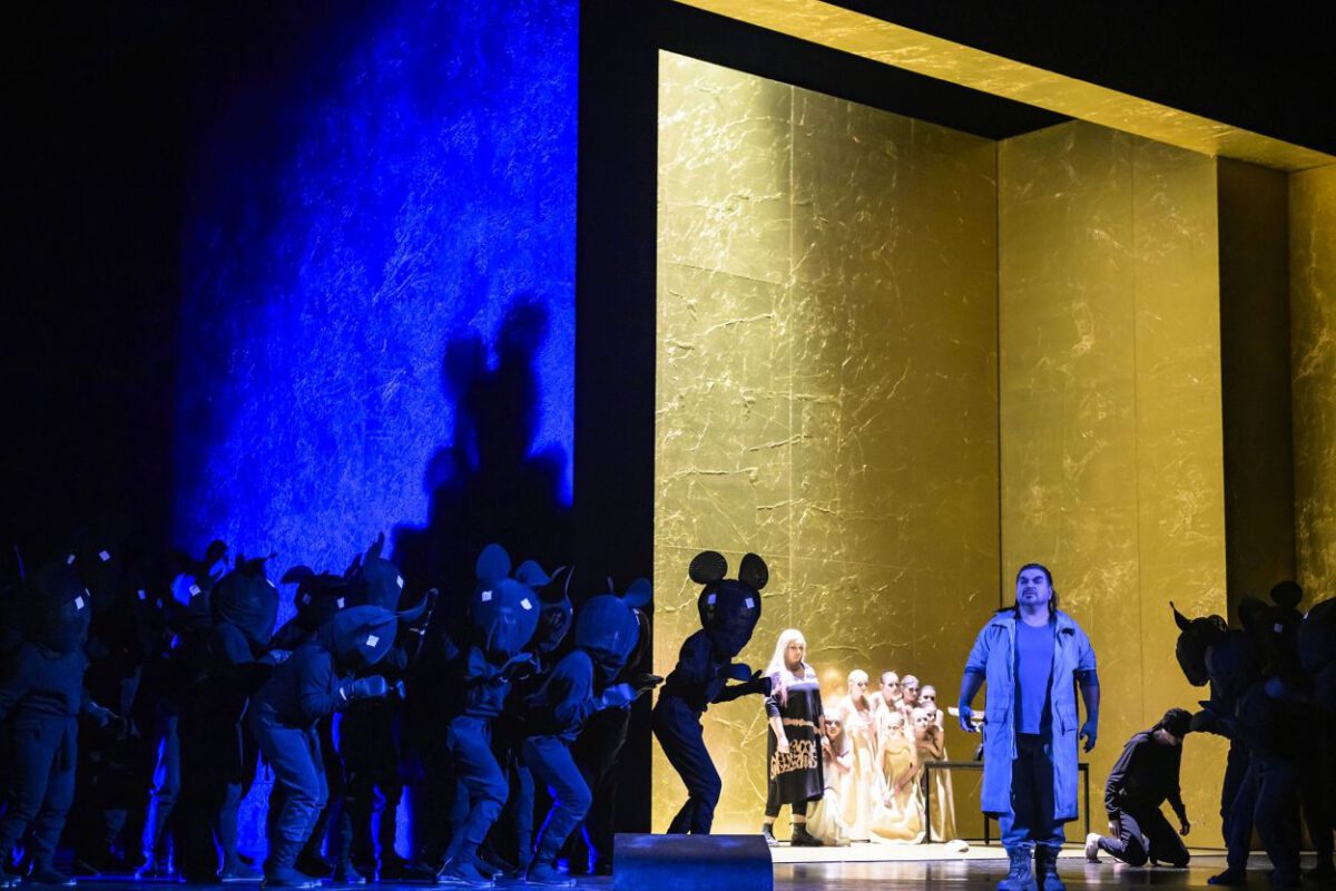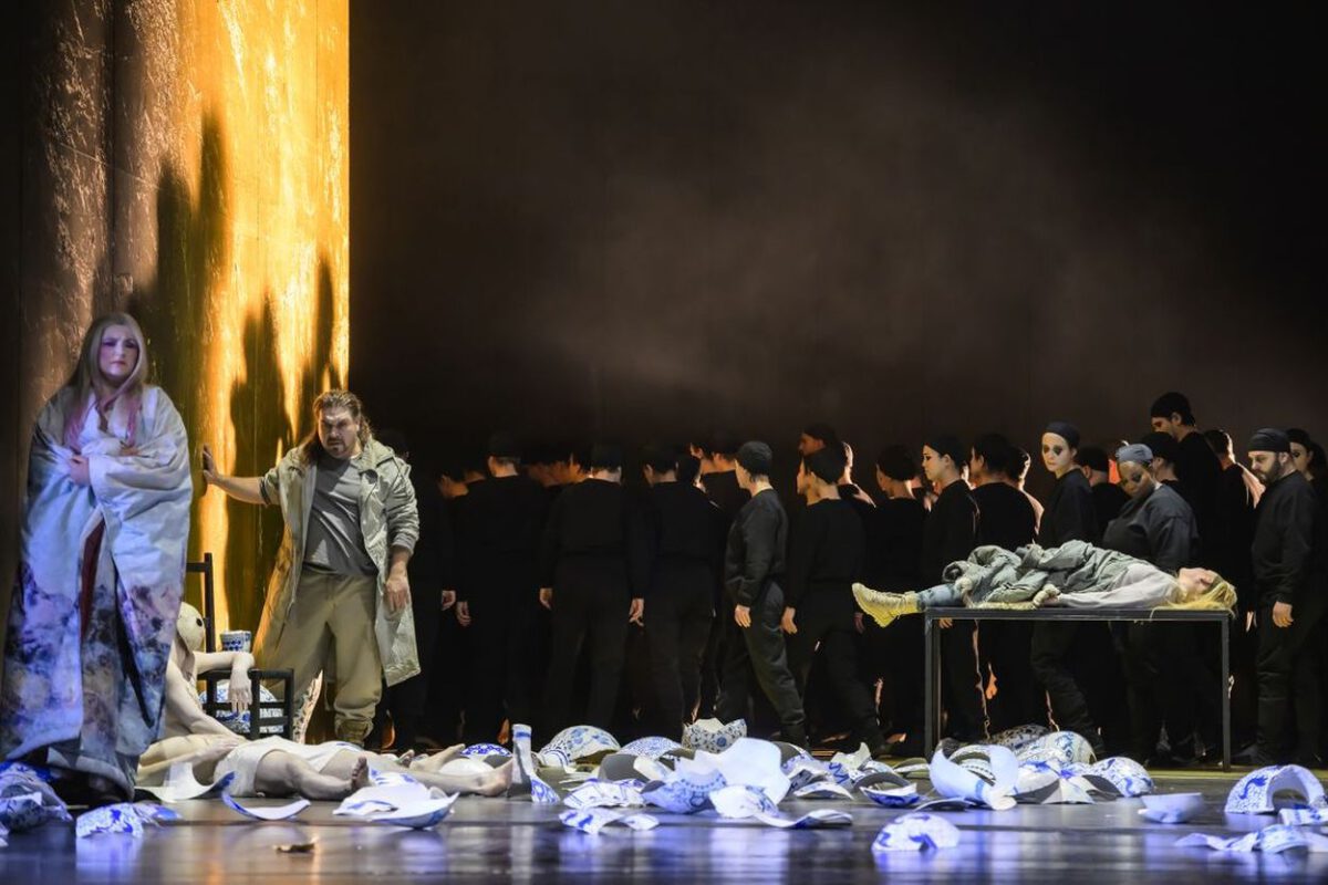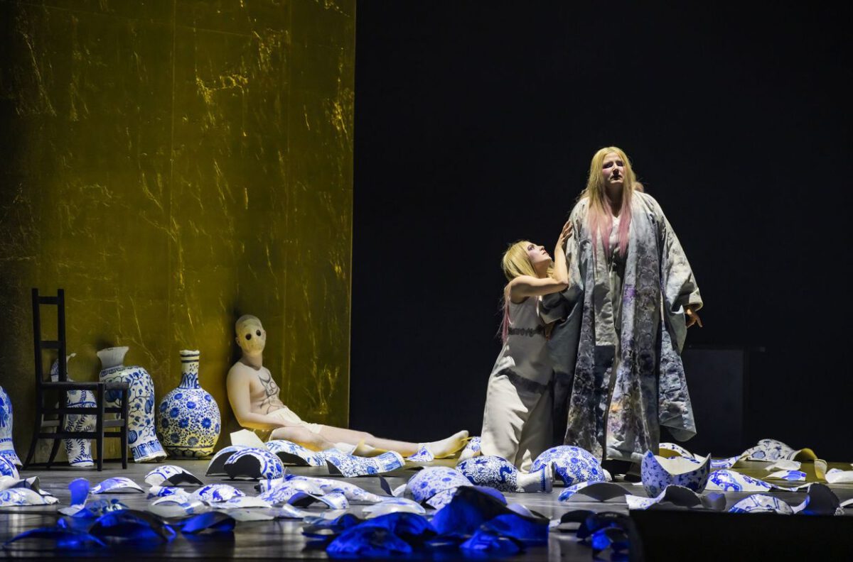 Bühnenbildner Sebastian Hannak hat einen großen, innen vergoldeten Würfel auf die Drehbühne gestellt, in und vor dem die grausame Geschichte abläuft. Chinesisch anmutende Requisiten gibt es nicht, wenn man von den kaputten Ming-Vasen am Boden absieht – es liegt hier alles Mögliche in Scherben. Unter den schwarzen Maus-Uniformen der Masse des Volkes sind einzelne Individuen nicht zu erkennen (Kostüme: Tanja Liebermann). Hauptanliegen des Regisseurs ist es herauszustellen, wie die Vorgeschichte Turandot nach wie vor prägt, und zu hinterfragen, warum sie solch eine eiskalte Furie geworden ist. Das sie quälende Trauma wird dadurch gezeigt, dass ihre Vorfahrin Lo-u-Ling (Marianne Besser) ständig nach Turandot greift, sie wie ein Fluch nicht loslässt. Erst ganz am Schluss befreit sich Turandot von ihr, indem sie die Urahnin von sich stößt und auf einen in der Mitte stehenden Tisch legt, auf dem vorher Liu nach ihrem Suizid aufgebahrt war. Vor der großen Veränderung war Turandot öfter in ihrer „Schreckenskammer“ zu sehen, wo verängstigte, möglicherweise ebenso wie ihre Vorfahrin geschändete junge Frauen und Mädchen unter dem Tisch kauerten und einige der getöteten Prinzen herumlagen. Ich bezweifle, ob die Zuschauer, die nicht vorher im Programmheft etwas über die Absichten des Regisseurs gelesen hatten, dies alles wirklich erkannt haben. Sei’s drum, insgesamt gelang auch durch die kluge Personenregie (Szenische Einrichtung: Ruben Michael) ein durchgehend fesselnder Ablauf der märchenhaften Geschichte.