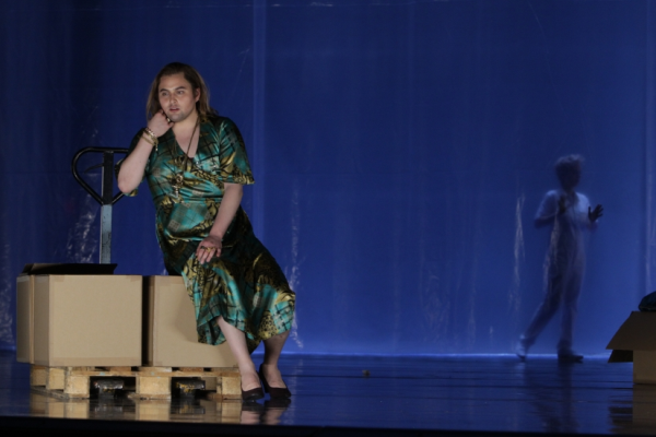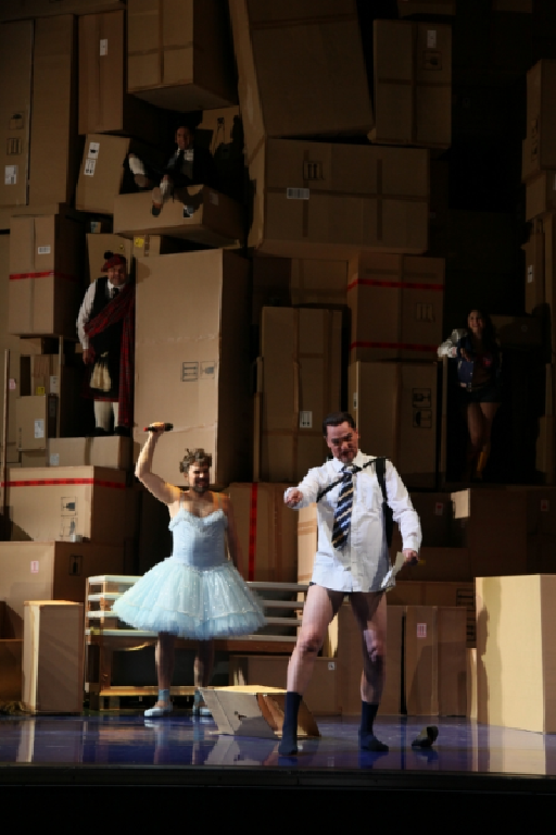 In Hannover haben der Regisseur Balázs Kovalik und sein Team Hermann Feuchter (Bühne) und Angelika Höckner (Kostüme) – das turbulente, nur teilweise witzige Treiben in eine geschäftsmäßige, zum Inhalt querstehende Welt versetzt, die an einen riesigen Lagerraum erinnert. Das Bühnenbild besteht aus übereinandergestapelten Kartons, die zwar Ordnung vorgeben, aber auch stets die Gefahr suggerieren, zusammenzubrechen. Die Geschlechterrollen im Stück sind schon in der Vorlage reichlich durcheinander geraten; der Regisseur setzt sogar noch einen drauf, indem er das Ganze fast in eine Travestie ausarten lässt. So tritt der Narr im hellblauen Tutu auf und Orsino gefällt sich darin, das Kleid der geliebten Olivia zu tragen. Im Übrigen wurde schnell deutlich, dass das ganze Spiel vom Narren arrangiert ist: Er sorgte anfangs noch vor Beginn der Musik dafür, dass die Zwillinge aus einem Karton stiegen und sich vor und hinter einem großen Spiegel wieder fanden. Wenn sich diese Position im Verlauf des Abends immer dann wiederholte, wenn ein Zwilling an den anderen dachte und von ihm sang, war das zunehmend irritierend, weil sich die beiden Darsteller abgesehen von der gleichen blonden Lockenperücke so gar nicht ähnlich sahen und das zusätzlich für Verwirrung sorgte. Insgesamt wurde vor der „Kartonwand“ ausgesprochen flott agiert; zusätzlich sorgten die von den Akteuren gefahrenen Gabelstapler für reichlich Bewegung und auch komische Situationen.