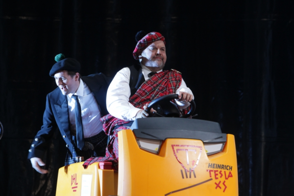 Auf der Seite der Nebenfiguren gab es ebenfalls ausgezeichnete Leistungen: Die beiden im typischen Schotten-Dress auftretenden, dem Alkohol reichlich zuneigenden Adligen Sir Toby Belch, hier in mehrfacher Beziehung an Falstaff erinnernd, und der teilweise im wagemutigen Duell-Wahn befindliche und dadurch witzige Sir Andrew Aguecheek waren mit kräftigem Bariton Stefan Adam und klarstimmigem Tenor Edward Mout. Als prolliges Kammermädchen Maria trat Julia Sitkovetsky mit sicher geführtem Sopran auf. Jonas Böhm als „Zwilling“ Sebastiano und als dessen Retter Antonio Michael Dries sowie die Chorsolisten Tadeusz Slowiak, Thomas Kubitza, Mohsen Rashidkhan und Jong-Soo Ko ergänzten das sehr spielfreudige Ensemble.