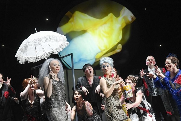 Dass der naive Candide, von Daniel Jenz in köstlicher Mischung aus baritonalem Ernst und aufgedrehter Überzeichnung gesungen, erst einmal einen Schwan erlegt, legt den Rückgriff auf den „reinen Tor“ nahe; dass im Hintergrund der Bühne auf einem runden Bildschirm rätselhafte, graphisch verbildlichte Operationen (Video: Daniel Hengst) ablaufen, deutet an, dass der transzendente Weltschöpfer längst durch undurchschaubare, alles bestimmende Programme abgelöst sein könnte: Garanten für die Sinnlosigkeit der Welt, die als einzige Antwort die ins Surreale gesteigerte Groteske zulässt?