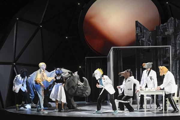 Bernstein und Wheeler stürzen sich in diesen abenteuerlichen Parcours und schöpfen ihn genüsslich-grotesk aus. Und Philipp Rosendahl macht mit seinem Co-Regisseur Volker Michl das einzig Richtige: Er lässt in einer nach vorne geöffneten, nach High-Tech aussehenden Kuppel auf der Bühne des Teams Daniel Roskamp/Brigitte Schima eine distanzierte, vielfach gebrochene Show ablaufen, die unweigerlich fragen lässt, ob wir es mit Menschen, Marionetten, Cyborgs oder einfach nur einem höheren Kasperltheater mit Kuh und Schafen zu tun haben.