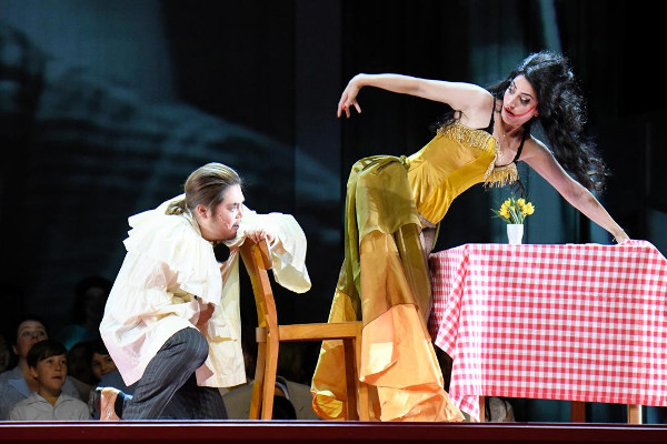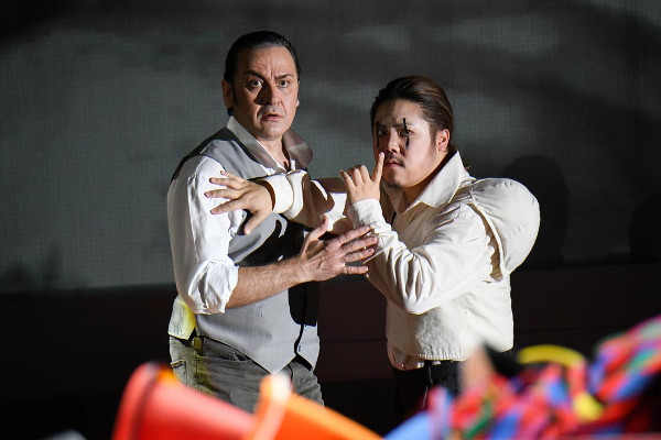 Der schöne Symbolismus der Aufführung, dem der Realismus der zwangsläufig ins Blutige abdriftenden Handlung zugeordnet wurde, findet leider nicht ganz im Musikalischen eine Entsprechung. Die Schwachstelle dieser Abends liegt im Tenor. Der Turridu des Gasts Marius Vlad verfügt nämlich leider nur über einen sehr engen und gepressten Ton, der indes für den Canio zwar nicht schön, doch immerhin charakteristisch klingt. Erstaunlich angesichts der Tatsache, dass sich die Tessitura des Turridu vor allem in der Mittellage bewegt. Dafür glänzt Khatuna Mikaberidze als lyrisch angelegte, doch dramatisch-schmerzhaftes Melos nicht scheuende Santuzza – so wie später die exzellente Ani Yorentz als Nedda. „I Pagliacci“ spielt, deutlicher noch als es in „Cavalleria“ sichtbar war, mit der Metapher des Theaters auf dem Theater – logisch, doch wird die Idee erweitert. Dass der Prolog von einem Akteur gesungen wird, der vorher durchs Parkett ging und sich an der Garderobe auf der Bühne auf der Bühne geschminkt hat, ist business as usual, doch wenn am Ende der Vorhang auf der Bühne fällt, der, wie in „Cavalleria“, die Vorderbühne von der Hauptbühne trennte und schließlich nur Nedda hinter demselben tot liegenbleibt, während Silvio, der in einem Spiel im Spiel im Spiel agierte, übrig ist, weil er eben nur spielte, haben wir es mit einer reizvollen und durchaus originellen Bestätigung des Satzes zu tun, dass eh alles nur Theater ist: selbst der „Tod“, selbst das „Leben“ auf der Bühne. Soviel zur „Wahrheit“, die in einer Oper (angeblich) komponiert wurde.