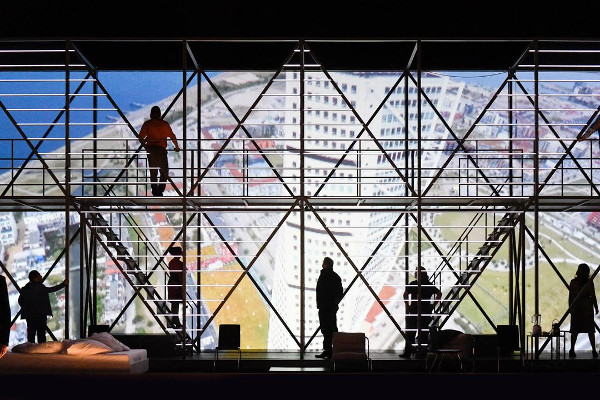 „Nach Golde drängt, / Am Golde hängt / Doch alles. Ach wir Armen!“, behauptet das Programmheft mit Goethes Gretchen und zeigt Wotan mit seinem Speer: einem Lichtstab, mit dem er – nicht der zunächst nur stehende und schauende Alberich, nicht die Töchter des Rheins – die Handlung in Gang bringt, indem die Neonrahmen der Bühne urplötzlich strahlen. Das ist einfach und sinnfällig, auch wenn wir erst in der „Götterdämmerung“ erfahren werden, was es mit Wotans (problematischem) Wissenserwerb auf sich hat, der der „Rheingold“-Handlung vorangeht. Aus Leuchtstäben, die ein monströses „W“ bilden, besteht schließlich auch Walhall – Walhall wie Wotan wie Wagner. Schön die Details: wann sieht man schon einmal, dass das Frühstück in Walhall aus knallroten und kerngesunden Äpfeln besteht? Loge braucht sie bekanntlich nicht; stattdessen scharwenzelt der möglicherweise (!) fast emotionslose Intellektuelle – ein Typ, der so aussieht, wie vor einigen Jahren jeder Theaterdramaturg aussah – um Fricka herum, die sich samt Perücke und von Henrike Bromber designten Wildkatzenkleid für den großen Tag aufgebrezelt hat, wenn er nicht gerade auf dem Steg steht und, begleitet von einem von David Worm gestalteten, beeindruckenden Werbefilm über die durch- und überflogene Welt, über Weibes Wonne und Wert spricht. Mit einem Wort: Überzeugend – so überzeugend wie die zugleich trivialen und doch nicht falschen Rollatoren, an die sich die Götter, die natürlich auch nur Menschen sind, nach dem Abgang der Riesen klammern. Wotan wird mit ihm noch nach Nibelheim steigen; auch das ist richtig und wird selten so inszeniert – denn wieso sollte Wotan in der Tiefe frischer sein als seine Familienmitglieder in den wolkigen Höhen?