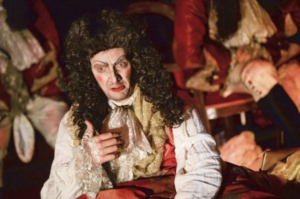 Im Folgenden scheint sich das Geschehen in für Fioroni eigentlich eher untypischen konventionellen Bahnen zu bewegen. Diese Vorgehensweise entpuppt sich letztlich aber nur als Mittel zum Zweck. Nachhaltig praktiziert Fioroni das altbewährte Prinzip des Theaters auf dem Theater, um den Ausklang einer Epoche zu versinnbildlichen. Die Zeit des Rokoko erscheint nur mehr als Reflexion der Darsteller, die in Kostümen dieser Zeit den „Rosenkavalier“ zur Aufführung bringen und an deren Ende wieder ihre moderne Alltagskleidung anlegen. Der erste Aufzug entführt den Zuschauer in das herkömmliche Gemach der Feldmarschallin, dessen Ausstattung sicher auch in Produktionen vergangener Jahrzehnte trefflich gepasst hätte. Dem im Hintergrund platzierten Himmelbett entsteigt zu Beginn nach einer heftigen Liebesnacht mit völlig nacktem Busen die Marschallin, die noch während der ganzen Szene mit Ochs Unterwäsche trägt. Auch im dritten Aufzug erscheint sie in dieser. Offenbar ist sie auf die Schnelle gar nicht mehr dazu gekommen, sich anzukleiden. Wenn es um Emotionen geht, sind alle Menschen unabhängig von ihrer Kleidung gleich. Und in dieser Beziehung hat die Feldmarschallin hier ja bekanntermaßen das Nachsehen. Ihr stellt der Regisseur zwei Doubles, ein riesiges und eines von normaler Größe, zur Seite, die aufgrund ihrer eckigen, kantigen Bewegungen wie Automaten wirken. Hier wird von der Regie nachhaltig das Schreckgespenst des emotionslosen Maschinenmenschen der Zukunft beschworen. Der mit Zahnrädern ausgestatte, abenteuerlich anmutende Rollstuhl des farbigen Mohammed scheint direkt Fritz Langs berühmtem Film „Metropolis“ entsprungen zu sein. Durch diese futuristischen Elemente innerhalb des traditionellen äußeren Rahmens wird das unbarmherzige Verrinnen der Zeit nur zu sinnbildlich. Und genau darin besteht ja auch das Kernproblem der Marschallin, die vor dem Altern große Angst hat. Das gnadenlose Verfließen der Zeit wird zudem durch einige Uhren und die Lebenskrise der aus heutiger Sicht mit 33 Jahren noch recht jungen Adligen, die das Scheitern ihrer Liebe zu dem viel jüngeren Octavian voraussieht, durch das Herausreißen ihres Herzens verdeutlicht.