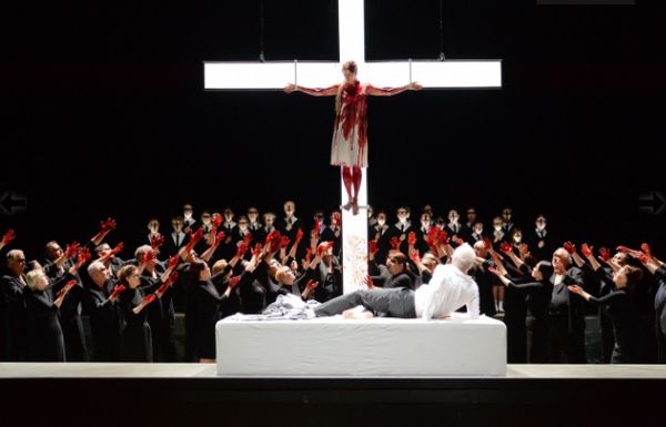 Kongenial unterstützte auch die stimmungsvolle Lichtgestaltung von Albert Geisel die Szenerie. In dem sich in die Tiefe stark verjüngenden Raum, welcher durch eine weisse Regalwand unterteilt war, auf welcher sich die Memorabilia an Marie verteilten, spielte sich die Handlung ab. Hinter der Regalwand konnte eine Leinwand für Projektionen der Verstorbenen heruntergefahren werden, die Bodenelemente der Hinterbühne liessen sich vertikal verschieben und boten so Raum für Chorauftritte und beängstigende Szenen, in welchen Paul der Boden unter den Füssen regelrecht wegzubrechen drohte. Ganz starke Bilder prägten die Heilig-Blut-Prozession, mit den Kindern, deren Gesichter mit schwarzen Kreuzen verunstaltet waren, oder der blutüberströmten Marie, welch wie der Erlöser am kalt-weiss leuchtenden Neonkreuz hing, während sich blutige Hände erst nach oben reckten und darauf die grauen Wände von Pauls Wohnung mit ihrem Blut beschmierten. Paul verfiel darauf in seine von religiösem Wahn besessene Raserei, erwürgte Marietta mit Maries goldenem Haarzopf und erwürgte schliesslich als Katharsis das omnipräsente Phantom seiner Marie. Und doch: So ganz sicher war man sich bei genauerem Nachdenken über das Gesehene und Erlebte plötzlich nicht mehr, ob da nicht doch noch mehr war, als bloss ein Alptraum…
