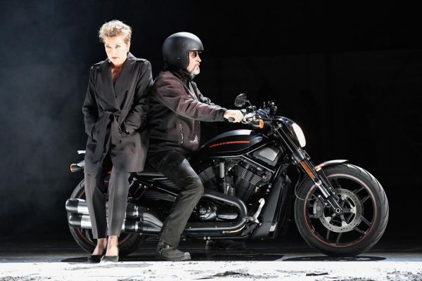 Schon die Walküren des letzten Kasseler „Ring“ kamen auf Motorrädern auf die Bühne, um in den Winterkrieg zu fahren., Endstation Stalingrad. Nun sitzt Fricka auf dem Teil, vor ihr der Fahrer, der offensichtlich auch ihr Lover ist: eine zart dröhnende und durchaus witzige Hommage an Michael Leinerts wichtigem und konzeptionell hervorragendem „Ring“ – und eine Möglichkeit, ein aufgetuntes Widdergespann auf die Bühne zu bringen, von dem, glaube ich, nicht nicht einmal diejenigen Zuschauer träumen, die glauben, dass so etwas wie „Werktreue“ im Sinne des Wagner des 19. Jahrhunderts heute noch möglich ist. Abschliffe, an die der Zuschauer sich nicht gewöhnen sollte, sind natürlich dort vorprogrammiert, wo eine altgermanische Waffe in der Wand eines Lofts, in dem der Blick zunächst auf die bunten Alkoholika in einer glaslosen Lichtvitrine fällt, so absurd ist wie der Kampf eines Jagdwaffenbesitzers mit einem Schwertträger. Aber was soll ein Regisseur auch machen, wenn er nicht ausschließlich auf Waffen der Gegenwart zurückgreifen will und kann? Woe Gertrude Stein schon so schön sagte: Ein Schwert ist ein Schwert ist ein Schwert. Immerhin wird im nächtlichen Kampf, der tatsächlich, Sieglinde sagt’s ja, im Dunkel vor sich geht, ein abstraktes Lichtschwert und ein Lichtspeer eingesetzt: was vermutlich als Zitat aus der Popkultur des Fantasy-Films gedeutet werden darf.
