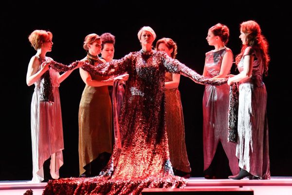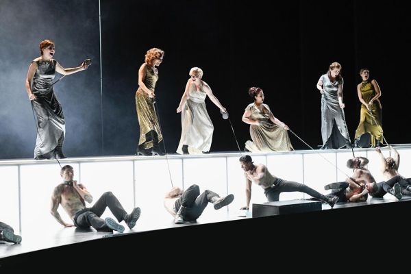 Die anderen Halbschwestern haben übrigens schon im zweiten Akt, dann wieder am Schluss zu tun. Schon während Wotans Jubelszene begleiten sie, vielleicht ein bisschen zu offensiv anfeuernd, ihren Papa, und schließlich bedecken sie Brünnhilde mit jenem Glanzstoff, den sie schon am schöngewandeten Leib tragen: Sexy Halbgöttinnen, die die zuckenden wilden Kerle wie SM-Ladys am Schnürl führen. Das Oktett hat auch rein akustisch schlicht Klasse: den schick-schönen Kostümen Henrike Brombers und den von Ungenannt hergestellten Masken samt Perücken und gestylten Echthaaren entspricht die selten zu hörende Einträchtigkeit ihrer höchst anspruchsvollen Einsätze. „Nebenrollen“? In der „Walküre“ gibt es sie nicht.