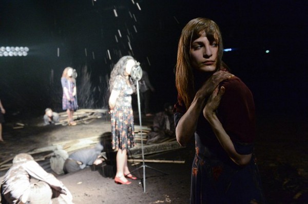 Dies also ist eine „Handlung“ zur Musik von Donna Summer, Aidan Baker, Ben Frost & Daniel Bjarnason, John King und Ethel: die taumelnden Figuren graben, als wär’s ein absurder Akt, den (von Matthieu Götz entworfenen) Bühnenboden aus und schaufeln wie verrückt den Sand nach oben. Mit hysterischen Wahnsinnsdrehungen, Erinnerungen an Breakdance und Rock’n Roll und langen Blicken ins Publikum hat der Abend begonnen, mit einem offenen Umbau wird er durch die Pause weitergeführt. Was folgt, ist rätselhafter – und sehr schön, auch wenn der Dramaturg der Meinung ist, dass der Israel-Palästina-Konflikt hier jederzeit sichtbar sei.