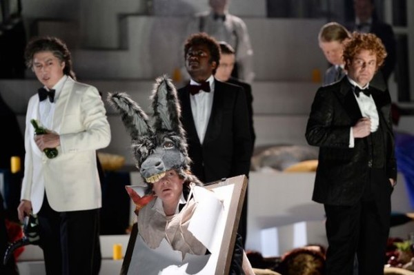 Es ist eine ausgesprochen oberflächliche, eigentlich nicht ernst zu nehmende Spaßgesellschaft, die Fioroni da auf die Bühne stellt. Nur auf letztlich belanglose Äußerlichkeiten bedacht, fehlt ihr jedweder Tiefgang. Feiern heißt das Obermotto, das hier nachhaltig gepflegt wird. Sowohl bei Hermann als auch bei Venus ist man immer nur auf lustvolle Partys aus. Letztere erscheint auch beim Sängerwettstreit, dessen Teilnehmer per Losverfahren durch Champagnerflaschendrehen bestimmt werden. Die Trennung zwischen Wartburg und Venusberg ist aufgehoben, die Gesellschaft tanzt in immer derselben monotonen Art und Weise auf beiden Festivitäten und pflegt eigentlich ein recht ödes Dasein. Zwischen den geistig hochstehenden Idealen der Wartburg und dem erotischen Treiben im Venusberg wird nicht mehr unterschieden. Dass Venus und Elisabeth den Titelhelden, auf den sie zu Beginn des dritten Aufzuges gemeinsam warten, unabhängig voneinander mit ihren nackten Beinen zu reizen versuchen, ist nur ein Tropfen auf den heißen Stein. Alles folgt immer demselben sinnentleerten, unsinnlichen Alltagstrott, der keine geistigen Ziele mehr kennt und dementsprechend im Laufe des Abends immer marodere Züge annimmt. Im dritten Aufzug sind die Gäste dann schon ziemlich heruntergekommen. Der ausgemachten Dekadenz dieser im Untergang befindlichen Gesellschaft trägt der Regisseur dadurch Rechnung, dass er den Tod in Gestalt dreier Frauen mit Totenkopfmasken ständig präsent sein läst. Eine der Todesbotinnen trägt ein Skelett bei sich. Das erste Opfer des Sensenmannes ist die dem Superstar Elisabeth hoffnungslos unterlegene Hirtensängerin, die mit der Sinnlosigkeit ihres Daseins nicht mehr zurechtkommt und sich demzufolge an der Rückwand erhängt. Sie ist die erste, die sich der Tristesse der Verhältnisse bewusst wird und davor per Selbstmord kapituliert. Auch Tannhäuser erkennt die Fragwürdigkeit dieser Versammlung. Er vermag nicht zu akzeptieren, dass sich die übrigen Minnesänger über das von ihm sehr ernst genommene Thema Liebe ständig nur lustig machen. Schließlich kann er ihre ausgemachte Ironie nicht mehr länger ertragen, lässt provokant die Hosen herunter und greift anschließend Elisabeth zuerst an die Busen und dann in den Schambereich – eine Grenzüberschreitung ersten Ranges, die aber für die eigentlich völlig wertfreie Spaßgesellschaft in keinster Weise akzeptabel ist und nachhaltig ihren Widerstand hervorruft. Jetzt zeigen die Gäste auf einmal ein anderes Gesicht. Sie nehmen gewalttätige Züge an, schlagen Tannhäuser nieder und zerbrechen ein Bild des Papstes auf seinem Kopf.