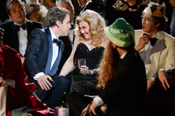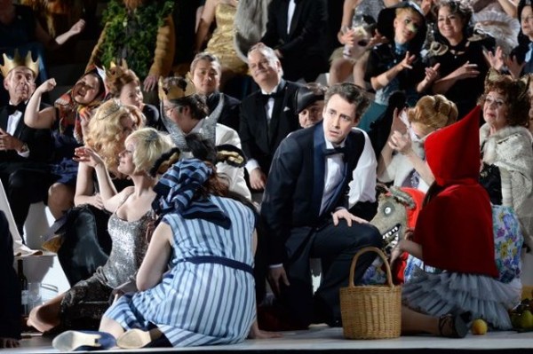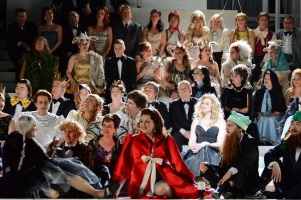 Wenn sich der Vorhang öffnet, erschließt sich dem Blick ein von Paul Zoller entworfener, riesiger Kubus mit Balkon, auf dem die gutbürgerlichen Eheleute Venus und Tannhäuser zu Beginn beim Austern-Frühstück einen heftigen Streit austragen. Das in steriles Weiß getauchte Innere des Quaders wird von einer im Hintergrund aufragenden Treppenlandschaft mit immer wieder aufscheinenden Projektionen bestimmt, die das Einheitsbühnenbild für alle drei Aufzüge bildet und mittels der Drehbühne in die verschiedensten Stellungen gebracht werden kann. Trefflich wird damit der Kreislauf der Welt symbolisiert, in der am laufenden Band Feste gefeiert werden. So geht die Fete bei Venus, in der eine junge Sängerin – ursprünglich der junge Hirt – beherzt ein pastorales Liedchen zum Besten gibt, nahtlos über in die ausgelassene Party des gut situierten Adligen Hermann von Thüringen, dessen Star die große Künstlerin Elisabeth ist. Ihre große Hallenarie gerät zur glänzenden Primadonneneinlage, in deren Verlauf sie einige der von Katharina Gault gefällig eingekleideten Gäste herzlich begrüßt. Unter diesen tummeln sich zahlreiche bekannte Märchenfiguren wie Rotkäppchen und der böse Wolf, die sieben Raben, Schneewittchen sowie die Prinzessin mit der goldenen Kugel und ihr Froschkönig. Hier gerät die Inszenierung zur heiter-vergnüglichen und liebevollen Märchenparodie, mit denen Fioroni den Brüdern Grimm, die ja lange in Kassel ansässig waren und dieses Jahr wie der Bayreuther Meister ihr Jubiläum begehen, nachhaltig seine Reverenz erweist.