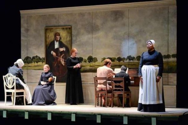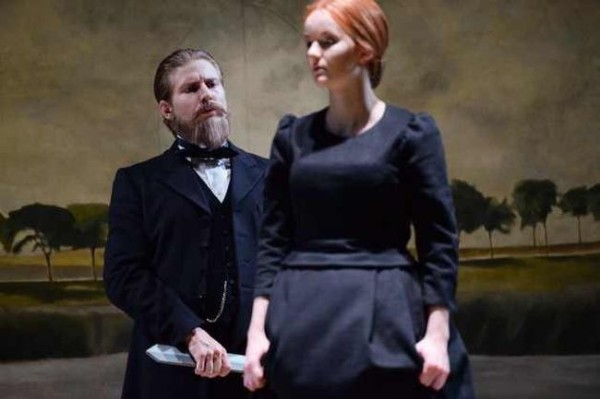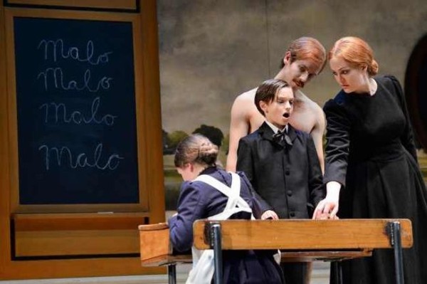 Das Stück hat im Lauf der Zeit vielerlei Interpretationen erfahren. Bis heute ist nicht so recht klar geworden, ob es sich bei dem Ganzen nun um eine Geistergeschichte, um eine Halluzination der Gouvernante oder um ein Stück über Kindesmissbrauch handelt. Alles ist möglich. Paul Esterhazy hat für seine gelungene Inszenierung den psychologischen Zugang gewählt und erzählt die Geschichte in Form einer Rückblende als Wahn der Gouvernante, die bereits zu Beginn den toten Miles im Arm hat. In engem Bezug zu der Handlung steht Sigmund Freuds Bericht von Miss Lucy R, einer seiner Patientinnen, die sich unbewusst in den Vater der von ihr gehüteten Kinder einer entfernten Verwandten verliebt hat und nicht weiß, wie sie mit dieser Situation umgehen soll. Dieser Essay des genialen Psychoanalytikers dient Esterhazy als Ausgangspunkt für seine Deutung. Bei ihm erscheint Freud persönlich auf der Bühne. Er singt den Prolog und beobachtet und analysiert im Folgenden das sich in Pia Janssens – von ihr stammen auch die gelungenen, altmodischen Kostüme – engem Bühnenraum, durch dessen Fenster man auf eine idyllische Landschaft mit einem naturalistisch anmutenden See hinausblickt, mit großer Stringenz ablaufende Geschehen. Da der Sänger des Prologs ja auch den Quint singen muss, hat der Regisseur den Psychiater im weiteren Verlauf der Handlung durch ein Double ersetzt. Um das Gespaltene in der Wahrnehmung der hier verrückten, mit manchmal etwas zwanghaften Bewegungen versehenen Gouvernante zu verstärken, hat er auch den übrigen Personen Doppelgänger an die Seite gestellt, wie es jüngst auch Frank Hilbrich in Mannheim bei derselben Oper – wir berichteten – gemacht hat.