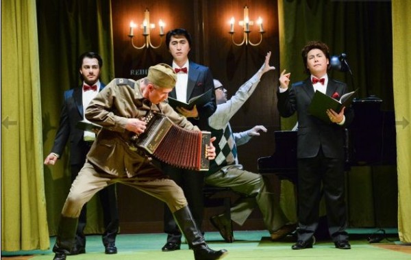 Warum gibt es hier Anspielungen auf die UdSSR? An der Wand hängt ein sowjetisches Propagandaplakat, mehrfach tritt ein Akkordeon spielender Rotarmist auf und schließlich kramt Prospero eine UdSSR-Fahne hervor, mit der er sich erhängt. Auch der Auftritt der großartig singenden Anna Nesyba als Frau mit Judenstern, die durch die Seitenwand bricht, bleibt rätselhaft.