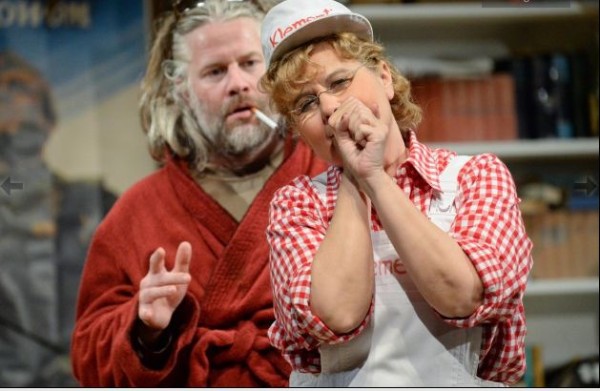 Der Sänger des Regisseurs Markus Francke, der seine Partie mit recht engem Tenor singt, darf vor der Vorstellung an die Rampe treten und behaupten, er sei der „Regisseur dieser Aufführung“ und er suche noch einen Freiwilligen aus dem Publikum, der nach einer kleiner Einweisung mitspielen dürfe. Es melden sich tatsächlich einige Freiwillige, „gewählt“ wird dann aber Schauspieler Gunnar Seidel, der auf der Bühne den Freitag verkörpert, der sich hier sogar mit Erde beschmieren muss und einige Tritte und Schläge abbekommt.