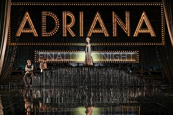 „Norma Desmond trifft die große Oper“ könnte man den gestrigen Abend treffend zusammenfassen, verlegt Falaschi doch die wenn nicht wahre, dann doch gut erfundene Geschichte um die französische Schauspielerin Adrienne Lecouvreur in die Glanzzeit des Hollywood der 1930er Jahre. Dass er von Haus aus Kostümbildner ist, ist ein Trumpf, den er bei dieser Lesart aufs Exzellenteste ausspielen kann: funkelnde Pailletten, Straußenfedern und ausufernde Kopfputze bilden einen Rahmen aus Opulenz und Glamour, in dem die Schauspielerin gegen den Verlust ihrer Lieben ebenso verzweifelt kämpft, wie gegen das Sinken des eigenen Sterns am Filmstarhimmel. Spätestens wenn sich die Gaze hebt, hinter der – coronabedingt ist der Abstand zwischen den Musikern sonst nicht einzuhalten – das komplette Orchester auf der Bühne platziert ist, fühlt man sich in eine frühe Musikrevue versetzt. Das liegt nicht nur an den wenigen filmischen Requisiten wie Kamera und Scheinwerfer, die Tausendsassa Gianluca Falaschi, der neben Regie und Kostümen auch das Bühnenbild verantwortet, auf die Bühne stellt, sondern auch an den Morgenmänteln mit Trompetenärmeln, den Turbanen und Fracks, die alle Protagonisten tragen. Lediglich der alte Theaterleiter Michonnet, unglücklich in Adriana verliebt, ist die kostümtechnisch die graue Maus und bleibt, während die Titelheldin von einem Wahnsinnskostüm ins nächste wechselt – in einen tristen Pollunder gehüllt und erinnert so an eine farblose Version von Olaf Schubert. Ein Fremdkörper bleibt diese Figur auch im Schlussbild, in der es fast scheint, als hätte Falasachi vergessen, einen Abgang für ihn vorzusehen, ehe sich die Liebenden zur Versöhnung und dem baldigen Ableben von Adriana ein letztes Mal in die Arme fallen.