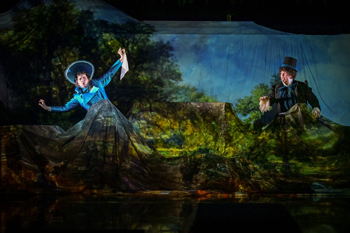 Es handelt sich um eine Ensembleoper, bei der die einzelnen Figuren überwiegend Text im Konversationston zu bewältigen haben und es wenig Raum für sängerische Profilierung gibt. Einzig Daniel Schliewa sind als Byron längere Passagen vergönnt, in denen er auf seinen blühenden Tenor aufmerksam machen kann. Man darf im Übrigen dem Mainzer Ensemble hier ausnahmslos rollendeckende und engagierte Leistungen bescheinigen.
