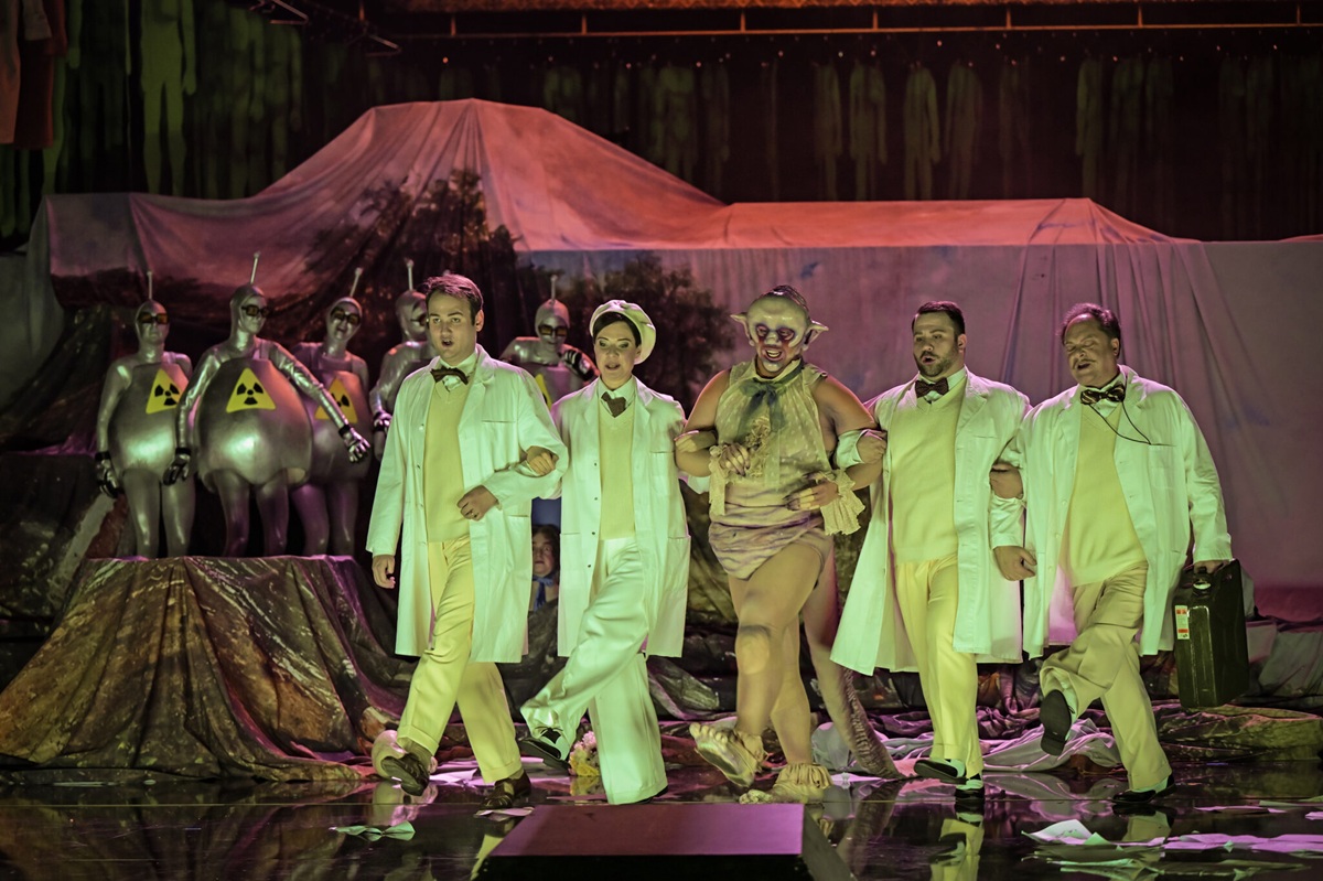 Das Produktionsteam um Lorenzo Fioroni hat die Vorlage mit einer Überfülle von Bildideen umgesetzt. Der erste Akt wird in einem großen Festsaal gezeigt. Die Prominenten erscheinen im weißen Dinner-Jacket. Gummi-Masken zeigen die Gesichter der in Bezug genommenen historischen Persönlichkeiten. Zum Singen werden die Masken jedoch abgenommen, was es angesichts der Fülle an Protagonisten nicht einfach macht, die ansonsten identisch gekleideten Figuren auseinanderzuhalten. Das bevorstehende „Dritte Reich“ spukt bereits herein, wenn etwa Liebermann mit einem Judenstern an der Brust gezeigt wird. An der Saaldecke schwebt eine aus mehreren ineinander gesetzten Ringen bestehende Skulptur, die offenbar Teil der Zeitreisemaschine ist. Ein sprichwörtlicher „roter Faden“ reicht auf dem Bühnenboden vom Orchestergraben bis in den Raum hinein und bleibt auch in der Bebilderung der „Zeitreise“ präsent. Diese Zeitreise wird mittels Videoprojektionen zu einem recht langen, nachkomponierten Synthesizer-Zwischenspiel namens „ROTOЯ ℤ⁵“ von Paul-Johannes Kirschner gezeigt. Es ist offenbar eine Sternenreise, die von Teletubbie-artigen Wesen mit Atom-Warnschildern auf dem Bauch begleitet wird. Für die Videos und das Bühnenbild zeichnet Paul Zoller verantwortlich (mit Co-Bühnenbildnerin Katharina Wegmann), der für den zweiten Akt die reizvolle Idee hatte, ein typisches Landschaftsgemälde des 19. Jahrhunderts wie eine Überwurfdecke auf den Kulissenelementen auszubreiten und aus dieser Decke heraus Lord Byron und seine Angebetete in historisch authentischen Kostümen (Annette Braun) auftreten zu lassen. Da die Zeitreise in einem Jahr angekommen ist, in dem Byron noch nicht der spätere große Dichter war, was das Libretto zu der kalauernden Bemerkung veranlaßt, es handele sich um dessen „Unter-Ich“, wird quasi eine evolutionäre Vorstufe seiner selbst mit auf die Rückreise in das Jahr 1929 genommen und zwar in Gestalt einer Mensch-Echsen-Chimäre mit langem Schweif und einer skurrilen Gesichtsmaske. Der dritte Akt ist der im Libretto am wenigsten gelungene, und auch das Produktionsteam kann nicht verhindern, daß er zerfasert.