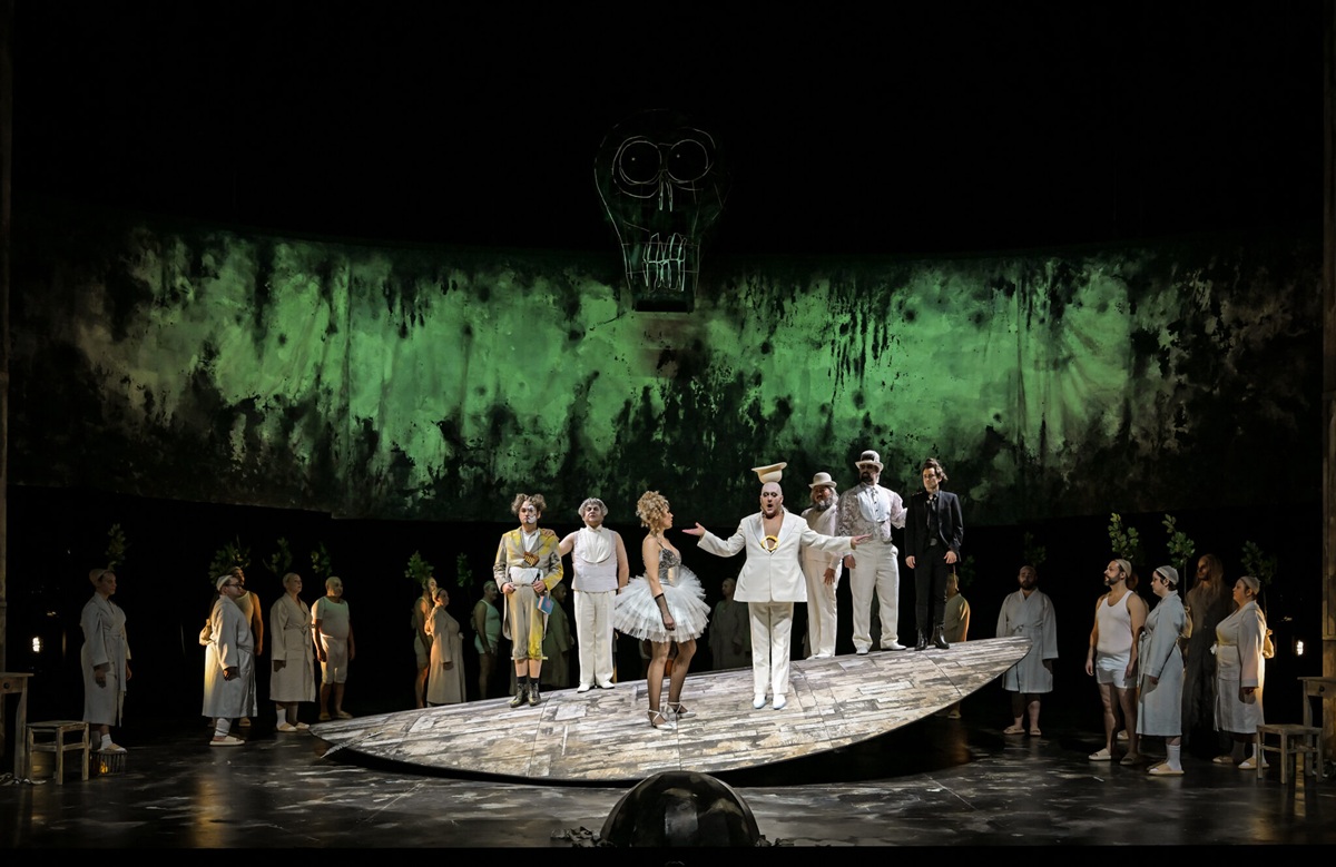 Wer nun aber befürchtet hatte, die Inszenierung von Dominik Wilgenbus würde den Plot in ein wohlfeiles Öko-Märchen umschreiben, wird schnell beruhigt: Außer, daß gelegentlich ein paar Baumsetzlinge auftauchen, bleibt die ursprüngliche Geschichte intakt. Zusätzlich zum vorgesehenen Personal ist noch eine stumme Figur in vielen Szenen präsent, ein in wallende weiße Gewänder gekleideter Mann mit langem, weiß-grauem Haar, der gelegentlich auf Stelzen geht und wohl die erwachsene Version von Paminas Vater darstellen soll – erläutert wird das, wenn wir nichts übersehen haben, nirgends, nicht im Besetzungszettel, der den Darsteller der Figur nicht aufführt, und auch nicht in dem lesenswerten Interview mit dem Regisseur im Programmheft. Das Bühnenbild von Peter Engel zeigt vor einem abstrakten, dunklen Hintergrund, der im Verlauf in unterschiedlichen Farben illuminiert wird und auch als Projektionsfläche für Auszüge aus dem Autograph der Partitur dient, eine Art breiter Wippe als Spielplattform, neben der es nicht vieler Requisiten bedarf, um ein abwechslungsreiches und vergnügliches Spiel mit Schikaneders Volkstheater-Vorlage zu arrangieren. Und weil wir in Mainz sind, dürfen wohl auch typische Nummern einer Kappensitzung nicht fehlen, wie ein urkomisches Männerballett zu „Das klinget so herrlich“.