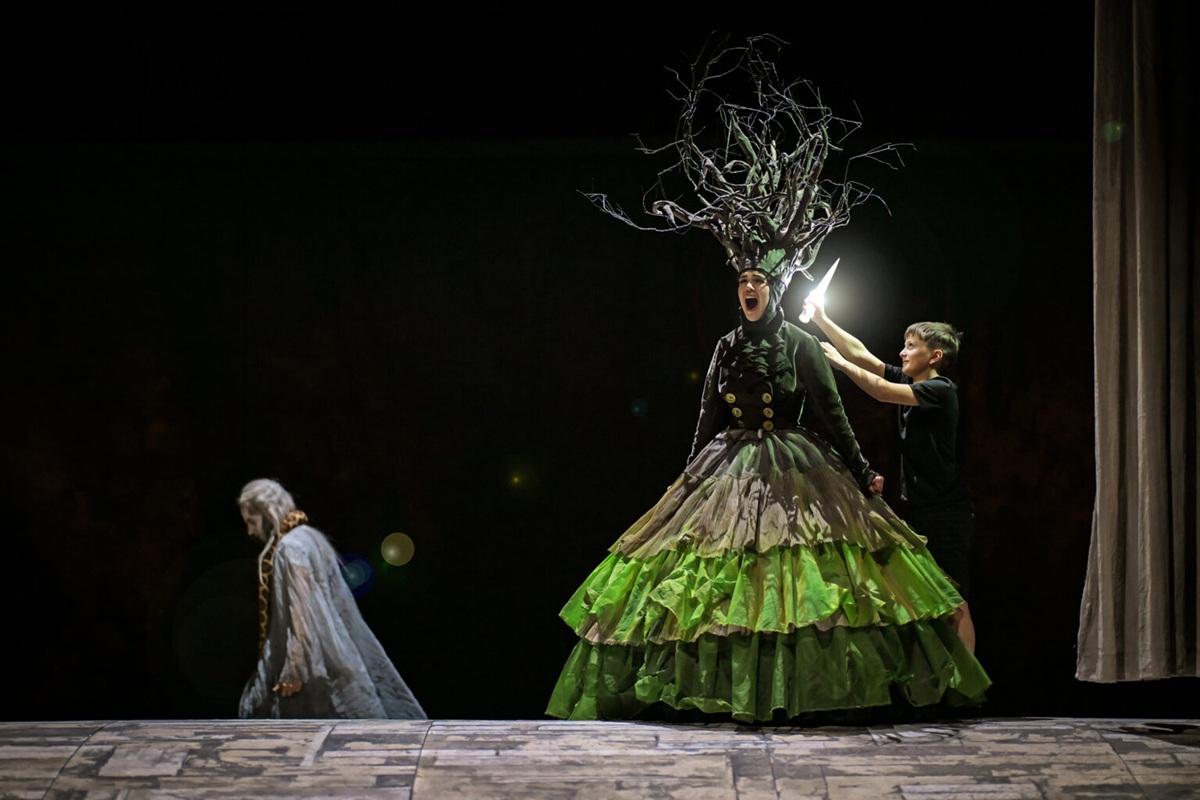 Mal unter uns Opernkennern: Können Sie aus dem Stand sagen, wo die titelgebende Zauberflöte aus Mozarts beliebtester Oper herkommt? Pamina verrät es am Ende, kurz vor der Feuer- und Wasserprobe: „Es schnitt in einer Zauberstunde mein Vater sie aus tiefstem Grunde der tausendjähr‘gen Eiche aus.“ Dieser Vorgang wird quasi als Vorgeschichte in der Mainzer Neuproduktion zur Ouvertüre gezeigt. Ein kleiner Junge, der Paminas Vater als Kind, den „König des Tags“ darstellen soll, macht sich mit einem Messer recht brutal an einer als Baum verkleideten Schauspielerin zu schaffen und schneidet ihr einen Ast ab, der nun als Zauberflöte dient.