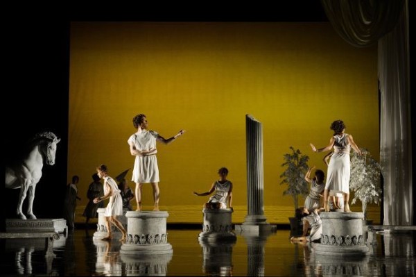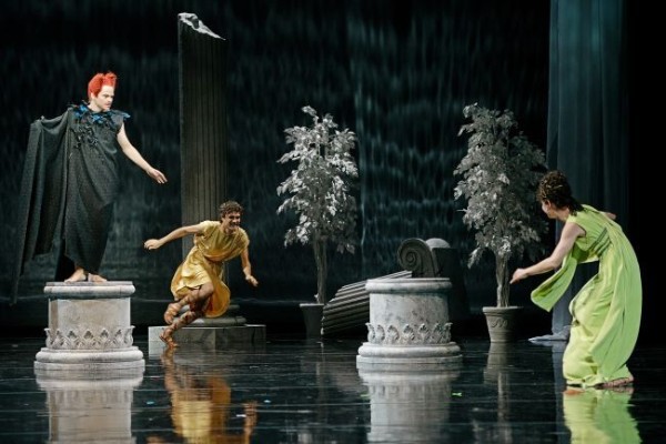 Dass die Produktion insgesamt dennoch nicht sonderlich zu überzeugen vermochte, verdankte sich dem allzu biederen, traditionellen Ansatzpunkt des Regieteams. Von einer Modernisierung wurde gänzlich Abstand genommen. Die Handlung spielt nach wie vor in Griechenland, in dem die Protagonisten in von Bregie van Balen geschaffenen antiken Tuniken erscheinen und ihre Händeleien in einem altgriechischen Ambiente mit reflektierendem Boden, ionischer Säule und einigen Säulenfragmenten austragen. Stephan Ostensens derart altmodisch ausgestatteter Bühneraum erfuhr darüber hinaus eine von Stefan Bauer vorgenommene ästhetisch ansprechende Beleuchtung. Wenn es nur das gewesen wäre. Dazu kam aber noch, dass Stromgren die Errungenschaften des modernen Musiktheaters anscheinend überhaupt nicht zu schätzen weiß. Er hat zu Purcells Werk überhaupt nichts zu sagen und beschränkt sich darauf, die Handlung belanglos und ohne sonderlichen Tiefgang, wenn auch frisch und munter, nachzuerzählen. Das ist nicht gerade originell. Zudem hält der Regisseur die Protagonisten bei den gesprochenen Texten zu einem überholten, heute nicht mehr gefragten pathetischen Deklamieren an, vom dem sich heutige ernstzunehmende Schauspielschulen längst und zu Recht zugunsten eines psychologischen Realismus entfernt haben. Diese Art, auf der Bühne zu sprechen, wirkte ziemlich altbacken. An diesem Nachmittag wurde Unterhaltung ganz groß geschrieben, der intellektuelle Faktor dagegen gänzlich ausgespart, was schade ist. Insgesamt haben wir es bei dieser Produktion mit einem spartenübergreifenden Abrutschen in die Konventionalität zu tun, das wenig aufregend war und dem in den vergangenen Jahren gepflegten ausgesprochen modernen szenischen Kurs des Staatstheaters Mainz eine rigorose Absage erteilte. Es bleibt zu hoffen, dass diese wenig geglückte „Fairy Queen“ eine Eintagsfliege bildet und die folgenden Mainzer Opern-Inszenierungen wieder etwas zeitgenössischer ausfallen werden.