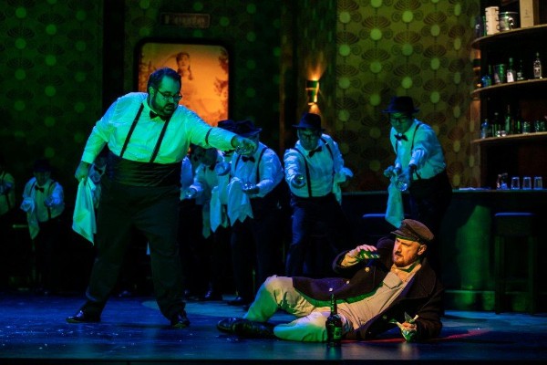 Kapitän Daland gerät auf der Heimreise mit seinem Schiff in einen schweren Sturm und muss mit seiner Mannschaft in einer Bucht anlegen. Während er sich in der Bar betrinkt, hält sein Steuermann, der Barkeeper, Wache. Auch er möchte heim zu seiner Liebsten und spätestens, wenn er singt: “Ach lieber Südwind blas noch mehr…“ begreift der Theaterbesucher, dass sich hier ein metaphorisches Geschehen anbahnt, aber auch wenn plötzlich eine Schar von gläserpolierenden und serviettenwedelnden Kellnern hereinrauscht und lustig singt: „Hei, wie die Segel sich blähn“.