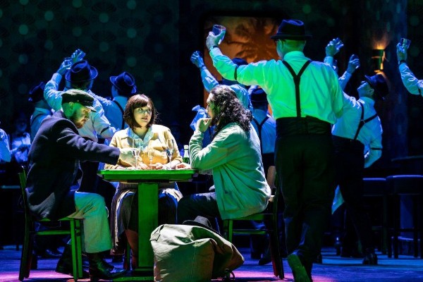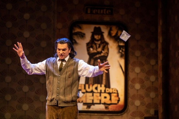 Die Ouvertüre öffnet den Blick in die Bar eines Kinos im Retrodesign der 50er Jahre. Vergilbte Tapeten, einige Tischchen und Stühle, der Tresen mit einem Barkeeper, der Gläser poliert und einen Gast bedient, an der Wand ein großes Filmplakat: „Fluch der Meere“. Davor sitzt eine junge Frau im braven Outfit: Faltenrock, Strickjäckchen und Blüschen. Sie faltet ein Papierschiffchen, tritt vor das Bild des Titelhelden, himmelt es an und wartet ungeduldig auf den Einlass. Diese Szene wiederholt und wiederholt sich, denn sie sieht sich den Film immer wieder an. Das Bühnenbild wird bleiben, alles wird sich in diesem „Wartesaal des Glücks“ abspielen, nicht auf dem Meer, nicht am Strand oder auf den Schiffen.