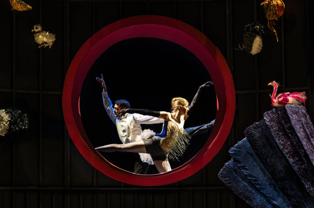 Die Regie hat der in Memmingen geborene Dominik Wildenbus. Der versierte Musiktheater- und Schauspielregisseur hat das Stück im Großen und Ganzen recht publikumswirksam auf die Bühne gebracht. Eingefügt sind in der Inszenierung ein (sehr toll agierendes) Tanzpaar, besetzt mit den vorzüglichen Tänzern Elena Zanato und Andrea De Marzo, die relativ oft, auch während der Gesangspartien auftreten. Dem Publikum gefällt es, mir nehmen die beiden ein bisschen die Aufmerksamkeit am gesanglichen Vortrag der Protagonisten. Auch ein bisschen gewöhnungsbedürftig ist die Einführung des alten Paares, würdevoll dargeboten von Barbara und Michael Neumann; die zwar nicht unbedingt stören, dem Stück aber auch keine große zusätzliche Besonderheit verleihen. Das Bühnenbild von Peter Engels ist dem Stück angepasst und angemessen, mit einigen schönen Ideen, wie der Miniaturbühne im ersten Akt und dem riesengroßen bunten Vogel, mit dem viel angestellt werden kann, im zweiten Akt. Die eindrucksvollen Kostüme von Uschi Haug sind bunt, farbenprächtig und schmeicheln dem Auge. Die Choreographie von Tamás Mester ist völlig dem Ablauf angepasst. Die Ausflüge und damit auch der kritische Ansatzpunkt in den drohenden Krieg und dessen Auswirkungen sind zurückhaltend gemacht und stören den insgesamt fröhlichen und positiven Ausgang nicht. Ob man dies in dieser Art machen soll, ist wahrlich Geschmackssache, dem Publikum jedenfalls hat es gefallen.