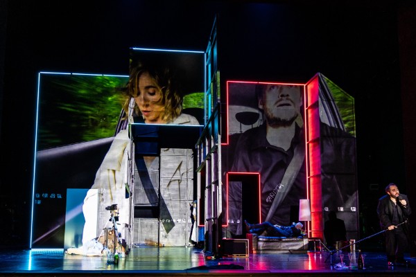 Regisseur Jochen Biganzoli geht mit dieser Inszenierung neue Wege. Auf einer bühnenfüllenden überdimensionalen Leinwand zeigt ein Video die Vorgeschichte. Dazu erklingt der 3. Satz aus Korngolds „Symphonischer Serenade“ op. 39. Fast wie im „Tatort“ betritt ein Mann die Pathologie, wo er seine tote Frau zum letzten Mal sehen wird, um sich zu verabschieden. Die Nüchternheit des Raumes im kalten Licht, der Anblick der Toten, das versteinerte Gesicht des Mannes und die Schwere der Musik vermitteln all die Tragik des Verlusts. Die nächste Szene zeigt ihn am nackten Tisch, vor sich Brot und Käse in der Verpackung. Er weint. Bilder im Hintergrund zeugen von glücklichen Zeiten. In Wut und Verzweiflung zerstört er auf dem Bett einen Rosenstrauß. Dann sieht man ihn auf dem Friedhof, es regnet, der Blick fällt auf ein schlichtes Holzkreuz und im Hintergrund auf einen schmucklosen Wohnblock. Die Kamera fokussiert eine rote Rose, die am Boden liegt und verwelkt. Die letzten Szenen zeigen ihn in der Wohnung am Fenster, während der Regen rinnt. Später kauert er vollständig bekleidet in der Badewanne. Videokünstlerin Jana Schatz hat mit diesen Filmsequenzen die unendliche Verlassenheit und den bohrenden Schmerz so verdichtet, dass sich das Publikum dem nicht mehr entziehen kann.