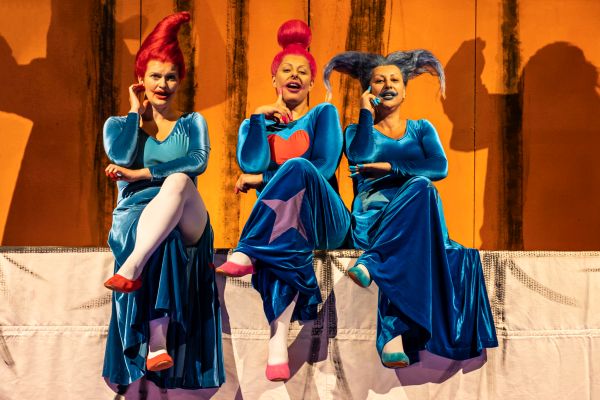 Diese Inszenierung gibt Gas, verkommt aber nicht zur Revue. Denn der dreidimensionale Bühnenraum bleibt konstant: drei riesige aufgemalte Türen in warmen Rot-, Pink- und Ockertönen, vor und hinter denen sich alles abspielt. Keine unnötigen Accessoires lenken ab und so ruht der Blick stets auf den Akteuren. Auch deren Kostüme wechseln nicht, mit Ausnahme des Chors.