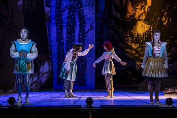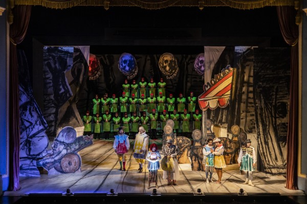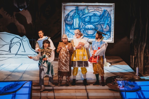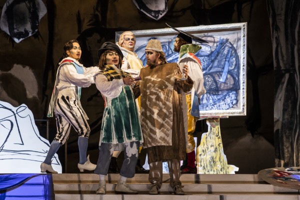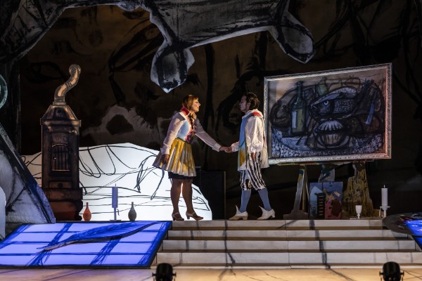 Im ersten Bild, es ist Heiligabend, frieren der Maler Marcello und der Dichter Rodolfo in ihrer kalten Dachwohnung und verheizen deshalb dessen Manuskript. Die Einrichtung, Ofen, Stühle, Sofa, Staffelei und Wände sind zweidimensionale Bilder, Pappaufsteller, nichts ist heimelig, alles wirkt düster. Ganz anders die Kostüme. Alle tragen mit groben Pinselstrichen bunt bemalte Kleidung, übergestülpte ärmellose Hänger, kuriose Hosen und typische Kopfbedeckungen, auffällige Krägen. Fast komisch, harlekinhaft, grotesk geschminkt symbolisieren sie die Lebenskunst der Bohèmiens, die trotz widrigster Umstände dem Augenblick etwas Gutes abgewinnen können. Der Philosoph Colline und der Musiker Schaunard, der als einziger etwas Geld verdient hat, kommen dazu und alle beschließen, später in ihre Stammkneipe, das „Momus“, zu gehen. Nachdem sie den Vermieter Benoît, der eigentlich kassieren wollte, betrunken gemacht haben, bleibt Rodolfo noch daheim, um einen Artikel zu schreiben. Die anderen ziehen schon los. Mimi, die kranke Nachbarin, erscheint und bittet um Feuer. Beide kommen sich näher und verlieben sich. Alex Kim als Rodrigo erobert mit „Che gelida manina“ nicht nur Mimi, sondern die Herzen des Publikums und wenn Deniz Yetim Mimis Arie „Si, chiamono Mimi“ so innig und berührend singt, zerreißt es einem fast das Herz.