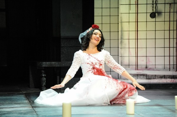 Der Regisseur Ansgar Haag lässt das Stück in den 20er bis 30er Jahren spielen, der Zeit nach dem 1. Weltkrieg. Alles in einem Land welches faschistische Züge aufweist und wo die Inszenierung greift. Auch die Kostüme von Renate Schmitzer passen sich dem an, dunkle, teilweise schwarze Uniformen der Männer stehen den Roben in Grautönen der Damen gegenüber, nur Lucia ist in Weiß, der Farbe der Unschuld, gekleidet. Das Bühnenbild von Christian Rinke ändert sich im ganzen Stück fast nicht. Eine Eingangshalle eines heruntergekommenen Sitzes der adligen Familien, eine Zelle, die der Folter dient und gekachelt ist. Aus diesen Kacheln fließt das Blut und es gibt auch den Blick auf den Friedhof frei. Die Probleme zeigen sich, ein Ebenbild Lucias erscheint des Öfteren, blutbefleckt und das Unheil, was auf alle zukommt, kann hier schon erahnt werden. Alles ist passend und auch teilweise beeindruckend. Aber was wäre das alles ohne die Musik.
