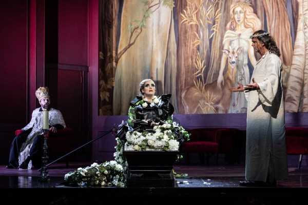 Schon die Ouvertüre verheißt: Hier war kein Dilettant am Werk, und wer jetzt ein karg minimalistisches Bühnenbild mit Protagonisten im Businesslook befürchtet, wird angenehm „enttäuscht“. Ein dunkles, sattes Rot symbolisiert Macht und Stärke des Zarenhofes, das Interieur ist sparsam Ton in Ton und konzentriert den Blick. Auffällig sind die vielen Türen in den Wänden, durch die die Personen von Raum zu Raum, von Szene zu Szene getrieben werden wie gleich im ersten Aufzug, als die Geburtstagsfeier für Fürstin Charlotte stattfindet. Statt im Kreis von Familie und Gästen zu feiern, bleibt sie für sich. Alexej, mit dem sie aus politischen Gründen verheiratet wurde, verabscheut sie und will sie loswerden, um mit seiner Mätresse zu leben. Grotesk böse geschminkt mit gewaltiger Haartolle soll er zwar furchteinflößend wirken, doch fläzt er wie ein infantiles Riesenbaby auf rotem Plüsch, gefangen in seiner Rolle, neben sich seine Mutter, die gleich der „Queen“ keine Regung zeigt und beziehungslos zu ihrer Umgebung einfach nur dasitzt und raucht. Der Chor als feine Abendgesellschaft wartet im nächsten Raum vergeblich auf Charlotte. Chevalier Victor, der sie verehrt, ist blind für die Schönheiten des Lebens. Im Hintergrund tut sich ein Märchenwald auf, in dem eine überirdisch schöne Fee umgeben von Tieren eine heile Welt symbolisiert. Aber er beklagt sein unerfülltes Dasein.