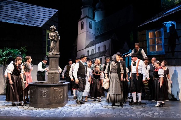 Diese einfache ländliche Geschichte wird Gott sei Dank, ohne große Änderungen in der Geschichte vorzunehmen auf die Bretter in Meiningen gestellt. Ein großes Dankeschön an den Regisseur Tobias Rott. Er stellt nicht sich in den Vordergrund mit einer nicht nachvollziehbaren Inszenierung, nein, er bringt die Geschichte schnörkellos, im Lokalkolorit, ländlich bedächtig, aber genügend spritzig voranschreitend auf die Bühne. Eine wohltuende Inszenierung, an der man einfach nur seinen Spaß haben kann. Auch das Schwäbeln wird nicht übertrieben, man kann allem ohne Probleme folgen und ist immer „im Stück“. Die Fäden der Meininger Hofkapelle hält Peter Leipold in seinen bewährten Händen, und auch von hier gibt es nur Gutes zu berichten. Mit straffer Hand führt er das Orchester durch die wunderschöne Melodienwelt, lässt es aufbrausen, wo es notwendig ist, es aber gleichzeitig auch ein bisschen zurücknehmen, wenn die eine oder andere Gesangstimme dadurch etwas bedroht erscheint. Schmeichelnd klingen die Töne aus dem Orchestergraben, umfließen die Szene und die Sangessolisten und insgesamt spielt die Hofkapelle, wie man es von ihr gewohnt ist, sauber, präzise, zurückhaltend und leidenschaftlich, einfach so, wie es die jeweilige Situation verlangt. Auch der von André Weiss in Szene gesetzte Chor weiß voll zu überzeugen und man bewundert immer wieder die Leidenschaft, mit welcher sich die Choristen in ihre Aufgaben werfen. Man merkt ihnen richtig an, wieviel Spaß sie an Ihren Auftritten haben. Und dies überträgt sich natürlich dann auch auf das Publikum. Farbenfroh, der damaligen Umgebung angepasst und einfach nur stimmig, die Kostüme von Kerstin Jacobssen, die den Augen der Zuhörer und Zuseher schmeicheln. Das wunderschön kitschig-einfühlsame Bühnenbild von Christian Rinke passt genau in das Konzept des Regisseurs. Alles etwas grell, bunt, manchmal eine Nuance übertrieben, aber immer gefällig schön anzuschauen und teilweise beeindruckend, auf jeden Fall gefällt es den Zuschauern, die mit Applaus nicht geizen – und dies zu Recht.