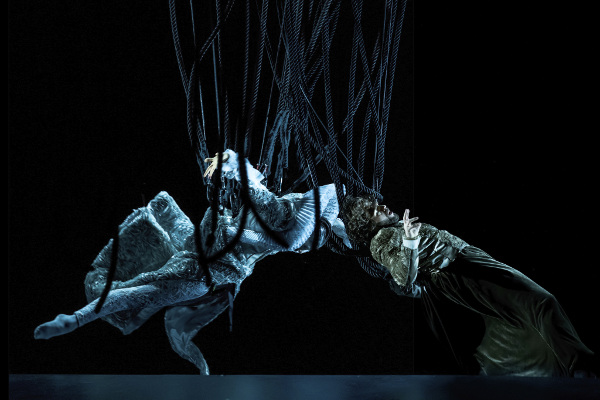 Auch Oberon und Titania vereinigen sich von Neuem, nachdem sie sich bis aufs Blut gestritten haben: in Seilen hängend, ein zauberhaftes wie teuflisch verkettetes Paar bildend. Rachelle Scott und Luis Tena, dieses überragende Paar aus der Zauberwelt des Goyo Montero schenkt sich nichts, bevor sie, das Luftwesen (daher eindeutig überlegen), dem Erdmann seine silberglänzenden Elfenkleidung abstreift. Symbolismus pur – aber mit welcher gestischen Ausdruckskraft! Die beiden Paare, die zueinander und doch nicht zueinander gehören, weil ein fauler Zauber genügt, die Beziehungen im Innersten sichtbar zu machen, werden von Nuria Fau (Hermia), Esther Pérez (Helena), Dayne Florence (Lisander) und Joel Distefano (Demetrius) durchaus unterscheidbar getanzt, obwohl sie in ihren Affekten ähnlicher sind, als es sich die Figuren vermutlich wünschen. Zu den Eigenheiten der Monteroschen Geschichtenerzählungen aber gehört immer das äußerst vitale Wiederspiel von Individuum und Masse. Die Compagnie, die im „Hochzeitsmarsch“, einem engen, zeremoniellen Schaustück in den Hofgewändern der Zeit des Earl of Oxford, betont zackig im Corps auftritt, macht schon schnell eine interessante Mutation durch: Kaum sind die hohen Herrschaften verschwunden, beginnt ein Zanken und Kreischen, das sich zu einem ungeheuren Chaos steigert: als Vorgeschmack auf das, was sich zwischen den Paaren dieser buchstäblichen Nacht noch zutragen wird.