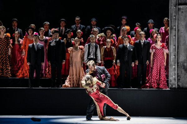 Es wäre reizvoll, einmal Wagners und Bizets Figuren miteinander zu vergleichen – um am Ende festzustellen, dass sie vielleicht mehr miteinander zu tun haben, als es Cosima Wagners Wort vom „grellen Hervortreten der jetzigen französischen Manier“ suggeriert. Im Übrigen war (ausgerechnet, denn sie saß ja im Glashaus) sie der Meinung, dass ein Mann, der seine Frau bei der Untreue ertappe, dass Recht habe, sie zu töten. Dies nur als Bayreuther Einstieg in die neue Nürnberger Carmen-Inszenierung, die, zumindest vom Optischen, gelegentlich vom Tänzerischen her, eher mediterran als deutsch anmutet, bis hin zur Tatsache, dass das Klischee vom flamencotanzenden Volk (das ja kein Klischee ist) sowohl auf der Bühne als auch im Zuschauersaal – durchaus ohne ironischen Abstand (es störe sich dran, wer will) – seine Bestätigung erfährt. „Sso ssind wir“, spricht mir eine charmante und lustige Frau aus Andalusien ins Ohr, als sich auf der Bühne die drei Frauen von der folkloristischen Tanz-Compagnie, darunter zwei gebürtige Frauen aus Spanien (Miriam Fernandez Benitez und Sara Ruiz, daneben Katharina Fixl), laut und notorisch schnell schnatternd um Don Jose streiten, bevor zu Beginn des letzten Akts ein begeisterter „Ole!“-Ruf aus der 10. Parkettreihe zur Bühne schallt. „Carmen“ ist, man hört‘s an diesem Abend, eine echte spanische Oper; es macht durchaus Spaß, gerade an diesem Abend in der Spanien-Kurve zu sitzen.