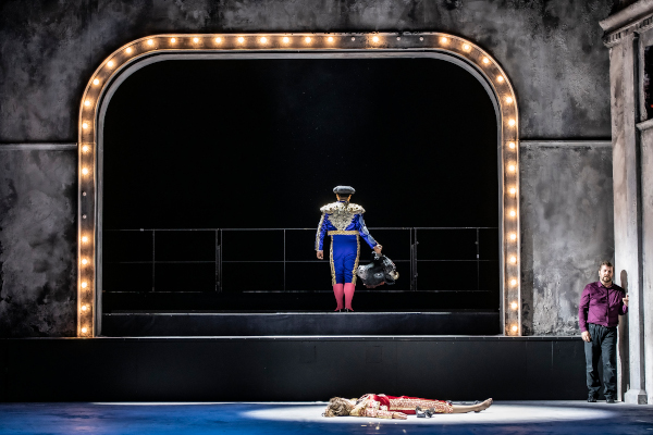 Dass das Bühnenbild eher Kuba als Andalusien verpflichtet ist, verschlägt dabei nichts. Die Inszenierung Vera Nemirovas und die Szenierung Heike Scheeles (wieder eine Meisterarbeit der Herheim-Partnerin) hat nicht den Anspruch, die Oper in einer konkreten Zeit und mit authentischen politischen Inhalten auszustatten, auch wenn die Bilder des ersten, zweiten und vierten Akts dies nahelegen. Im Gegenteil: Die Tatsache, dass Akt 1, 2 und 4 in einem ruinierten Theater spielen, das wir uns in Havanna vorstellen können – kam frau angesichts der Habanera auf diese Idee? – verweist auf Anderes, denn hier wird keine Positionierung vorgenommen, sondern, das macht spätestens das zweite Bild klar, ein typisch scheelescher Fantastischer Realismus gesetzt. Wenn wir den Entr‘acte zum dritten Akt hören, der den ersten Teil des Abends beschließt, versinkt plötzlich der untere Teil der Bühne auf der Bühne, um den Sternenhimmel sichtbar zu machen, unter dem die Schrecken des 3. Akts vor sich gehen werden – und Carmen, zärtlich und zärtlichkeitsbedürftig wie keine Zweite, setzt sich neben den traurigen Clown, der die Gestalt des Kaschemmenwirts Lillas Pastia (mehr als eine Charge: Anton Koelbl) angenommen hat, legt ihren Kopf an seinen und fasst seine Hand, während der sie im Arm hält. Und dazu Bizets zauberische Musik, die von einer Idylle träumt, die es für Carmen nicht geben wird. Die Schönheit der Oper…
