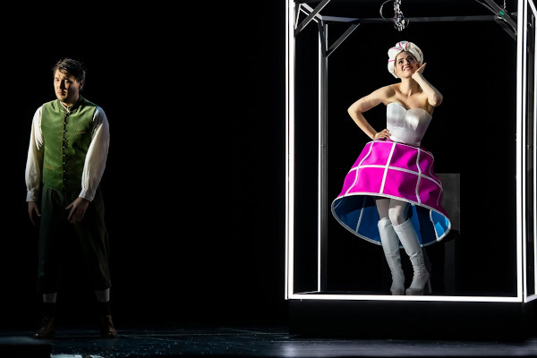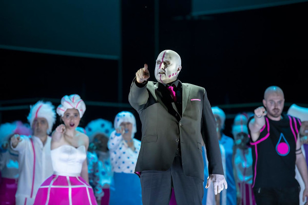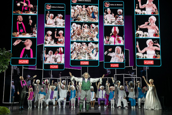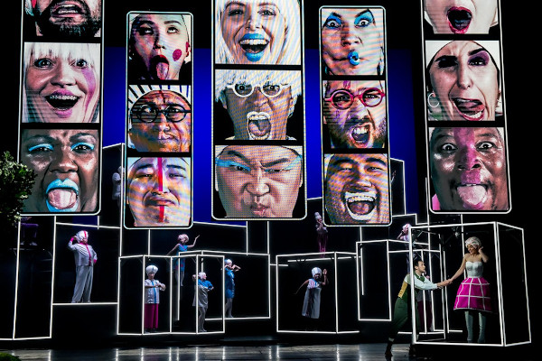 Das Erstaunliche dieser Idee ist: Sie funktioniert. Sie steht in keinem Moment quer zu Felice Romanis Text und Donizettis Musik. Sie modernisiert den Stoff rein äußerlich, ohne die zeitlos scheinende Geschichte in ihrem Wesenskern zu verletzen (die auffallend vielen jungen Leute, die die Aufführung besuchten, scheinen es gerade so empfunden zu haben). Adina bleibt über weite Strecken die wilde Katze, Dulcamara – der neue, also der mit Glatze und Gesichtsbemalung – der Einflüsterer, Belcore der brutale Kerl. Einmal singt Dulcamara 2.0 aus dem Off, während man seine Fratze, riesenhaft vergrößert, auf dem Monsterdisplay (Video: Torge Möller) betrachtet, der das Stilmittel der Ausstattung dieser Inszenierung ist. Emine Güner hat auch die fantasievollen Kostüme entworfen: Sci-Fi-Mode, individuell gestaltet, mit drei Grundfarben versehen, die die babyhaften Töne Blau und Rosa mit einem diversen Lila ergänzen. Also: Eine Infantilgesellschaft – aber eine, die sich in den Kostümen gut bewegen kann: auch in denen, die jeder Otto-Schenk-Inszenierung (nichts gegen Otto Schenk!) Ehre machen würden, und in denen die Dörfler ihr traditionelles Spiel spielen.