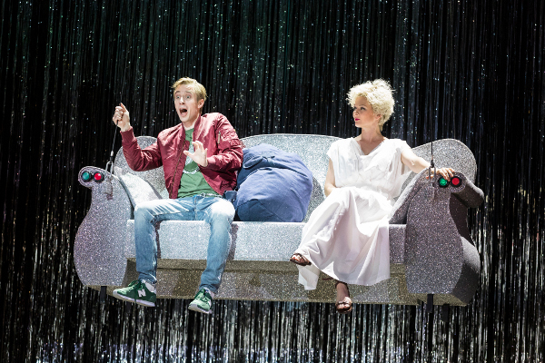 Schöne Bilder: Die gibt es in dieser Inszenierung zuhauf. Julia Hansen hat eine Bühne gebaut, die auf der Bühne zwei weitere Bühnen – ganz oben das öfters geschlossene Himmelstheater – und eine elegante Wandverschiebetechnik aufweist, um die Szene jeweils zu vergrößern oder zu intimisieren. Herrlich der monumentale Glitzervorhang, der so gut zum kokett beflügelten Glitzersmoking von Amor passt. Sie, die Liebe, spielt auch die Minerva: Michaela Maria Mayer meistert betörend die koloraturenreichste und in ihrer Beweglichkeit ungewöhnlichste Partie dieser auf die Deklamation gestellten Oper. Sie ist (auch wenn sie, pardon, unmöglich an „meine“ Theatergöttin aller Theatergöttinnen heranreichen kann, weil keine Darstellerin an die Pallas Athene der Jutta Lampe in Peter Steins Schaubühnen-„Orestie“ heranzureichen vermag) – kurz: die Mayer ist eine wunderbare, im Glanz ihrer frohlockenden Stimme und ihres souveränen Auftretens agierende Schutzgöttin, der sich Odysseus zurecht vertraut fühlen kann. Von ihrer Hand würde sich vermutlich auch manch Zuschauer wie zufällig berühren lassen, um jene Kräfte zu erlangen, über die ihr Heros einen Akt später verfügen muss… Wunderbar schon ihr Auftritt im „göttlichen Wagen“, mit dem sie witzigerweise den Telemaco nach Hause bringt – ein silbernes Luftsofa mit leuchtenden Druckknöpfen, die, unsachgemäß betätigt, auch eine Göttin ins Schwitzen bringen können.