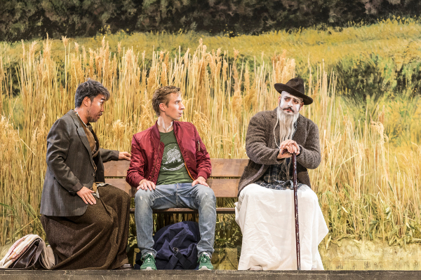 Habe ich schon geschrieben, dass diese Meisterinszenierung den Homer mit tiefem Ernst, aber auch mit charmantem Humor ins Heute bringt? Darum bewegt auch die Erkennungsszene von Vater und Sohn, vor der prachtvoll illusionistischen Bergkulisse, hier so bezwingend und rührend. Telemaco, auch er hat bewegteste Koloraturen zu singen, ist mit Martin Platz glänzend besetzt. Nach dem Tamino, dem Matthäuspassionsevangelisten etc. etc. hat er seiner Rollenliste ein weiteres Glanzstück hinzugefügt. Auffallend auch der Tenor des Alex Kim, dessen guter Schweine-Hirt Eumete rollendeckender und vokal genauer nicht sein könnte. Es ist überhaupt erstaunlich, dass die Technik des „recitar cantando“, die einem „normal“ ausgebildeten Sänger vielleicht nicht unmittelbar zu Gebote steht, an diesem Abend stilistisch meist sehr überzeugend gemacht wird. Also müssen auch genannt werden: Iestyn Morris als „menschliche Zerbrechlichkeit“ und Freier Pisandro, Alexey Birkus als „Zeit“ und als Nettuno, die gefeierte Irina Maltseva als blondes Gift namens „Schicksal“ und als Sexy Melanto, die sich vom ungerecht und furchtbar gestraften Eurimaco alias Dávid Szigetvari gern begrabschen lässt. Hans Kittelmann ist Giove und der Freier Anfinomo. Unter der Gruppe der Amanten, die der zu heiratenden Frau die Modelle ihrer Eigenheime als Geschenke eitel darbringen, ragt Wonyong Kang als Primus inter pares heraus. Er ist es, der vergeblich ein Komplott gegen Telemaco und seinen Vater startet – kein Wunder: der Mann ist ein dramatisch profunder Bass. Yongseung Song besticht mit den parodistischen Koloraturen des komischen Schmarotzers Iro. Martina Langbauer überlebt, als treue Amme Ericlea (mit züchtiger Kopfbedeckung, denn Kleider machen Leute, auch und gerade auf dem Symboltheater), das Massaker und darf wenige, aber wichtige Sätze rezitativisch beisteuern. Nicht ganz unwichtig sind auch die Statisten; die drei Najaden, in denen Odysseus buchstäblich badet, dürfen während des Freierschlachtfests jene Spruchblasen hochhalten, die wir aus Comics kennen: Smash, Bang, Slosh… Humorvolles Verfremdungstheater, das Spaß in die Sache bringt – und den Kontrast zur ernsten Frage, was denn das alles für Götter und Menschen bedeute, umso markanter ermöglicht.