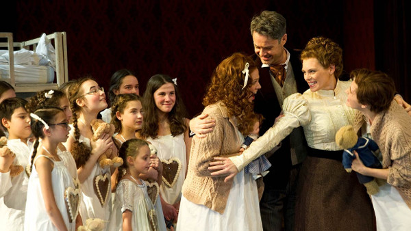 Noch immer aber stehen der phänomenal wortverständliche und stimmschöne Bariton Jochen Kupfer und der Hänsel der Irina Maltseva im realen Raum und im Märchenwald des bürgerlichen Traumheims. Beide zeigen das Staatstheater auf dem hohen Niveau, das es in der Intendanz Peter Theilers errungen und ersungen hat. Neu ist Emily Newton. Wie wandlungsfähig sie zu agieren und zu singen vermag, zeigt sich schon, im Vergleich zur Hausherrin in der Villa, an ihrem Nürnberger Einstand als Busenmodell Anna Nicole Smith in Turnages Meisteroper. Größer könnte der Abstand zur Gertrud nicht sein, was nicht nur an Maske (Helke Hadlich, Gerti Hauser) und wilhelminischem Kostüm (Gabriele Heimann) liegt. Emily Newton singt eine charakterstarke, wenn auch verständlicherweise labile Frau (und es ist immer wieder schön, zu bemerken, dass ein Satz wie „Ja, da liegt nun der gute Topf in Scherben“ sich in der Lesart Andreas Baeslers und seines Ausstattungsteams nicht auf die kaputte Keramik bezieht. Ebenso hellsichtig und tiefsinnig wirkt ja auch Hänsels schlichtes „Gretel, ich weiß den Weg nicht mehr“). Schade nur, dass Emily Newton nicht immer so wortverständlich singt, wie es die vielen kleinen und großen Kinder in der Nachmittagsvorstellung verdient haben. Gretel aber ist die beste Trumpfkarte dieser Stunden. Julia Grüter verbindet Natürlichkeit mit einer glasklaren Artikulation, spielt gut, sieht dazu noch gut aus – Opernherz, was willst du mehr?