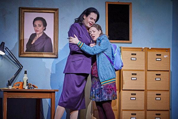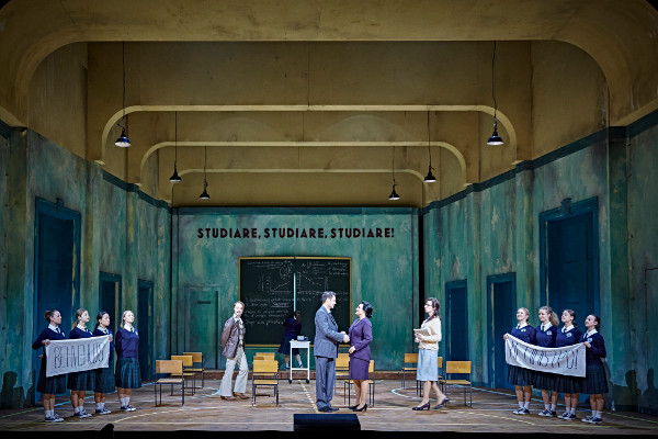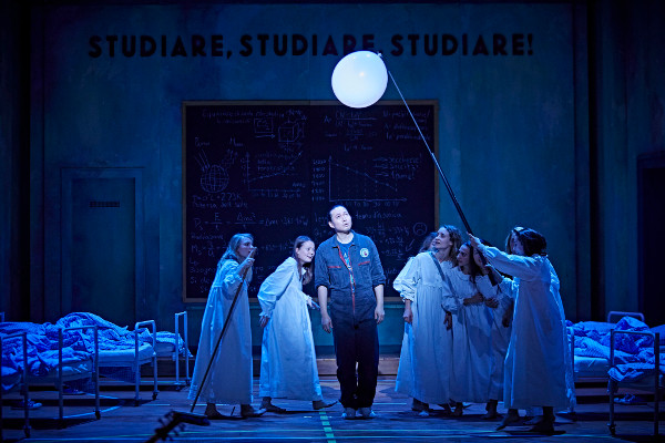 Wie man sieht: wir befinden uns mitten in einer Tragikomödie, zugleich, so der Regisseur Jens-Daniel Herzog, in einer „fiesen Geschichte“, in der die Macht (des höchsten Gottes) über den Idealismus (des naiven Mädchens) und die normative Kraft des Faktischen (Endimions ewiger Schlaf) über das siegt, was wir als „normale“ Liebesbeziehung definieren würden. Die Nürnberger Inszenierung unterschlägt nun nicht die traurigen Aspekte dieses „Dramma per musica“, das zurecht immer wieder gespielt wird. Sie bindet sie jedoch in eine insgesamt komische Dramaturgie ein, in der sich etwa der Gott – kongenial verkörpert von Jochen Kupfer – in Dianas Kostüm wirft, um sich unter der Dusche quasi nackig zu machen und die junge Frau in falscher Gestalt zu vögeln. Wir schauen also auf eine Burleske, die, man muss das bewundernd anerkennen, so gut wie nie dem Text widerspricht. Die Übertragung in die Gegenwart ist einfach, aber stimmig – einfach deshalb, weil die Idee zunächst einmal simpel ist, dass es sich bei der trockenen Öde, die der Krieg auf der Welt hinterlassen hat, und die der oberste Gott beseitigen soll (stattdessen verfolgt er lieber junge Nymphen), um die Folgen des Klimawandels handelt. Falsch ist sie schon deshalb nicht, weil eben jener „höchste aller Götter“ sich gerade nicht für die Ökologie, sondern für sein Sexleben interessiert. Insofern haben wir es bei dieser „Calisto“ mit einer Fortsetzung jenes politisch-satirischen Kabaretts zu tun, das schon im Venedig des mittleren 17. Jahrhunderts so populär war; an den Zuständen, die Obrigkeit betreffend, scheint sich nicht viel geändert zu haben. Und wenn die junge Calisto als Musterschülerin eines von Mathis Neidhardt entworfenen Mädcheninternats in die Handlung eingeführt wird, die die Leiterin eben dieses Instituts mehr als gewöhnlich verehrt und neben ihre physikalischen und mathematischen Formeln zur Erläuterung der Klimakatastrophe die Anweisung „Si deve agire! Subito!!“ schreibt, gibt es keinen Grund, daran zu zweifeln, dass diese Sympathisantin der Greta Thunberg von den politischen Gewalten nur enttäuscht werden kann. Wichtiger aber ist das, was und wie Julia Grüther singt: denn phänomenal ergreifend und stimmschön sind nicht nur ihre beiden Lamenti über den schrecklichen Betrug, den sie erleiden musste. Wie anders agieren da die anderen jungen Frauen in Dianas Schule: doch eher als Fightergirls.
