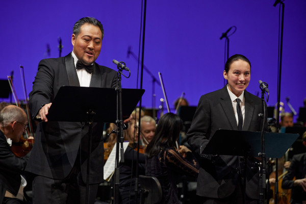 Allein auch diese Aussage ist Unsinn – denn eine wenn auch konzertante Aufführung einer Oper ohne szenischen Ausdruck, ohne jene Emotionalisierungen, die, angeblich, allein eine Bühnenaufführung zu vermitteln vermag, ist unmöglich. Wenn Julia Grüter als Mélisande, Sangmin Lee als Golaud und Samuel Hasselhorn als Pelléas vor dem Orchester stehen, muss der Zuhörer und -schauer nichts (ich betone: nichts) vermissen. Wenn Julia Grüter in der Begegnung mit Pelléas wie unschuldig in sich hineinlächelt, wenn Sangmin Lee einen brutalen Golaud zum Ausbruch bringt und Samuel Hasselhorn einen zwischen Jugend und Reife changierenden Pelléas genügend andeutet, wenn sich das Liebespaar im einzigen nichtpragmatischen Gang an diesem Abend auf dieser Bühne zueinander wendet, eine der berühmten Debussyschen Pausen erklingt und sie sich plötzlich ihre seltsame Liebe gestehen, wird lediglich das Pünktchen auf ein I gesetzt, das vom ersten Takt an im Raum steht. Kommt hinzu, dass es gerade Maurice Maeterlincks Text, in Verbund mit Debussys durchaus nicht unkonkreter oder gar raunender Musik, ist, der im Zuhörer ein höchst intensives inneres Theater provoziert, das mit den sparsamsten Gesten und der deutlichen Mimik der Sänger harmoniert. Was an diesem Abend entsteht, ist ein Gesamtkunstwerk aus inneren und äußeren Bildern, die ohne Bühnendekorationen auskommen; nur das Licht am Rückprospekt sorgt für Wirkungen, die man impressionistisch nennen könnte, wäre das Wort nicht so problematisch, weil es eine Verschwommenheit suggeriert, die Debussys Musik eben gerade nicht besitzt.