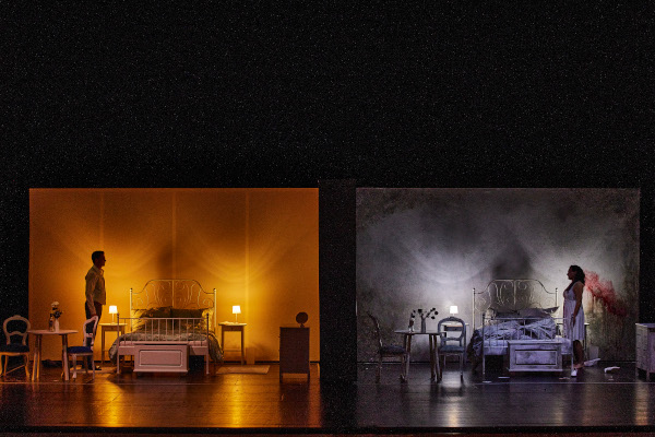 Am Ende des „Blaubart“ wird nach eben diesem Preis gefragt. Wenn Judith, nicht schnell, aber deutlich genug, den Mann verlässt, der sich als beziehungsunfähig erwies, weint auch sie die Tränen, die in der sechsten Kammer verschlossen sind. Die drei Frauen, schwer verletzte Opfer des Mannes, haben sich schon vorher befreit, indem sie einfach gingen. Die Tragödie beginnt nicht mit Béla Balász‘ Prolog, sondern mit einem Gedicht von Else Lasker-Schüler: „Du hast ein dunkles Lied mit meinem Blut geschrieben…“ Balász‘ Text hat viel mit jenem Blut zu tun, das im zweiten Teil des Abends nicht allein in der Musik fließt. Lanzino inszenierte den „Seelenmythos“ (so der Librettist über sein Werk), in dem die Burg und ihre Kammern pure Gebäude einer verschlossenen Innerlichkeit sind. Betreten Judith und der Herzog den Raum, so betreten sie – getrennt – zwei gleichgebaute Schlafzimmer: nur, dass bei Blaubart ein warmes Licht den Raum erhellt und bei Judith das kalte Licht die blutigen Flecken an den grauen Wänden offenbart. Man weiß schon, wie es ausgeht, wenn Blaubart alle persönlichen Gegenstände, die sie in die Ehe mitbringt, beseitigt. Räumlich getrennt, sind sie doch verbunden: v.a. durch die Gewalt; agiert Blaubart links, so reagiert Judith rechts, als stünde er im Raum. Folter- und Waffenkammer: es sind Schläge und ein brutaler Geschlechtsverkehr. Schatzkammer und Garten: es ist ein Schmuckstück und eine Schwangerschaft – aber das Blut klebt am Hals wie auf dem Bauch. Wird endlich die Trennwand zwischen Mann und Frau beseitigt, hören wir also die grandiose – und erschütternde – Musik von Blaubarts Land, erscheint für einen kurzen Moment die Utopie einer Öffnung. Der Rest ist eine Befreiung, die keine sein kann: Judith geht, auch dieser Preis ist hoch, der Mann bleibt in seiner Finsternis zurück: ein Opfer seiner Psyche, aber auch ein Gewalttäter an den Frauen, deren Liebe er verriet.