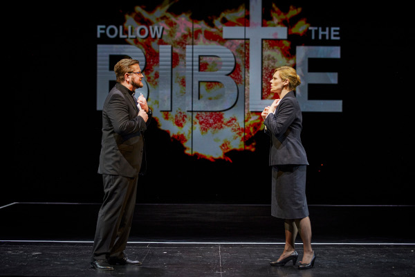 Wir kennen das Bild schon vom letzten Bayreuther Tannhäuser: dass die Figur gleichsam aussteigt, weil Leben und Theater einfach nicht mehr vereinbar scheinen. Und schließlich verlassen alle Sänger, die im epischen Theater dieses Abends am Bühnenrand sitzen, wenn sie gerade nicht dran sind, verstört und wütend die Bühne. Was bleibt, ist die Heilsbotschaft der beiden Chor-Kommentatoren, aber auch hier sehen wir, dass es sehr viel Kraft kostet, die Zeilen über die Lippen zu bringen: der charismatische Fernsehprediger ballt energisch die Fäuste und schließt, scheinbar nach innen sehend, die Augen. Mehr Ratlosigkeit als Heilsgewissheit, wie der Dramaturg Georg Holzer schrieb. Wer aber glaubt, dass diese Deutung grundstürzend neu sei, irrt, denn schon André Obey, der die Vorlage für Duncans Libretto lieferte, lässt die Sprecherin von einer Flucht Lucretias träumen. „Eine feministische Version, in der Lucretia durch ihren gegen den Willen ihres Mannes vollzogenen Selbstmord ihren Körper und ihr Ich zurückfordert, muss erst noch geschrieben werden“ ( Germaine Greer). Voilà, hier ist sie.