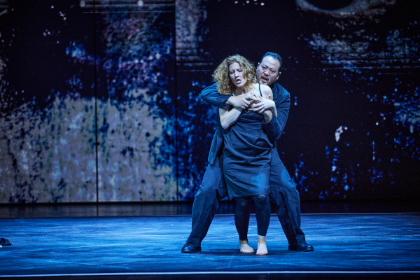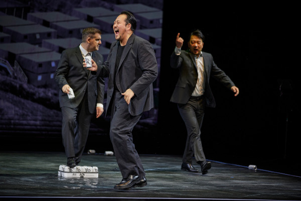 Zudem kann man auch dieses Stück – wie wohl jedes, wenn‘s was taugt – auf einer fast leeren Bühne spielen lassen, als wär‘s eine Inszenierung von Peter Brook. Ein paar Stühle und Notenständer, ein Lichtquadrat auf dem Boden, eine Videowand im Hintergrund, mehr braucht es nicht, um Brittens und Duncans Welttheater szenisch auszustatten. „Follow the Bible“, lesen wir zu Beginn, das Christenherz glüht und brennt (Lucretias Herz wurde ja auch geröstet), am Anfang wie am Ende, an dem das Opfer, das keines sein will, zur Heiligen erklärt wird: auch dies eine Sage, freilich aus dem neueren Rom. Das von Stefan Bischoff produzierte Video zeigt auch, zu Tarquinus‘ Teufelsritt durch den Tiber, ein eilendes Pferd im Bild-Negativ, dem die graphischen Verstörungen flimmernd eingezeichnet wurden. Erscheint Lucretia, schauen wir auf 12 Schmink-Münder; die Bilder erstarren im Moment des vollzogenen Schocks, der im Silhouettenbild der Vergewaltigung (zwei schwarz ausgeschnittene Körper vor der Lichtwand) szenische Realität wird. Herzog inszeniert das Werk als Parabel zwischen Bühnenrealität und entlarvtem Schein, was die Männergesellschaft, die für Lucretias Unglück verantwortlich ist, nicht bagatellisiert. Collatinus, der Mann der tief verwundeten Frau, ist nicht besser als Tarquinius, der sie schlug, und als Junius, der Intrigant im Hintergrund, der schließlich dafür sorgt, aus der Vergewaltigung durch den Etruskerherrscher politisches Kapital zu schlagen, indem er die Römer zum (bei Titus Livius schließlich erfolgreichen) Aufstand anzustacheln. Ohne den Vergewaltiger in Schutz zu nehmen, muss allerdings angemerkt werden, dass er nicht zu Lucretia geht, um sie zu Boden zu ringen. Sein Plan liegt lediglich darin, so steht‘s geschrieben, ihre „Keuschheit“ zu beweisen. Natürlich ist dies ein widersprüchliches Projekt, dem das Scheitern eingeschrieben ist, aber erst die „Wollust“ und die Fehlinterpretation ihrer „feuchten Lippen“ macht aus ihm den Berserker und nützlichen Idioten, den Junius braucht, um den Gegner zu erledigen. Sangmin Lee spielt ihn denn auch als brutalen Kerl, der nicht besser ist als seine meisten bierdosenknackenden Kumpel. Wonyong Kang ist ihm als Junius, auch vokal, und etwas lyrischer eingestellt, ein ebenbürtiger Gegner, während Nicolai Karnolsky als gehörnter Ehemann den Collatinus als politisch übervorsichtig, also plump agierenden Diplomaten gibt; sein allzu offensichtliches Abwiegeln angesichts von Lucretias Geständnis ist bewusst stupid – so wie die letzten zehn Minuten der Inszenierung eine Deutlichkeit besitzen, die möglich und verständlich, aber weniger subtil ist als Vieles, was wir vorher sahen.