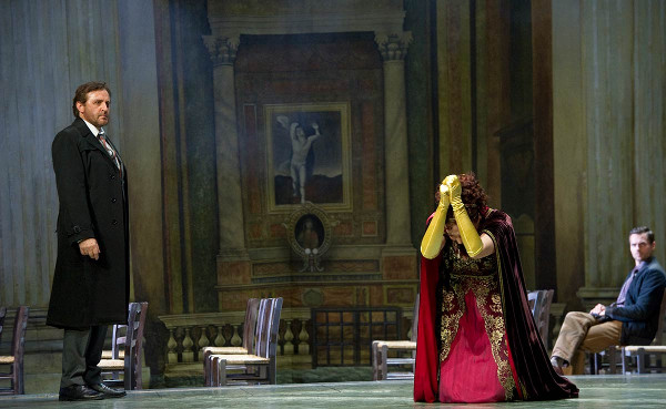 Tatsächlich kann man das alles, ohne sich zu verbiegen, auch ganz anders sehen. Ziehe ich nämlich einige Sonderbarkeiten und Widersprüche ab, die aufs Konto der gar nicht so dummen Idee vom falschen Schein, vom Theater auf dem Theater, von einer propagandistischen Kunstwelt innerhalb einer Diktatur gehen, bleibt tatsächlich ein ungeheuer spannender Abend, bleiben die absolut ernst genommenen Affekte und Leiden der drei Protagonisten übrig. Nun fand ich es gar nicht so schlimm, dass inmitten des fröhlichen Minstrantengesinges ein Kamera- und Regieteam für kurze Zeit die Illusion eines „schönen“ (Opern-)Inszenierung bewusst bricht. Geschenkt. Es konnte die Spannung und die dramaturgische Genialität des ungeheuren Bogens dieses Eröffnungsakts zwischen einer nur unwesentlich vom fliehenden Angelotti gestörten Liebeskomödie und dem ungeheuren Tedeum nicht stören. Auch der gesamte zweite Akt, also der Garderobenakt, ist von packendster, logischster Stärke; dies nicht allein deshalb, weil Puccinis, Giacosas und Illicas blutige Dramaturgie nicht zu schlagen ist. Es ist tatsächlich logisch, das Verhör in einem heutigen Theater selbst und das Gespräch mit der Diva in „ihrem“ Haus, dem Zentrum ihrer Kunstwelt anzusiedeln.