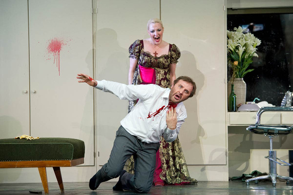 Dies nämlich ist purer Realismus; dass ein Terroropfer auf der leeren Bühne eines Opernhauses von den Handlangern und Bluthunden der Macht skrupellos hingerichtet wird ist nicht weniger wahrscheinlich als das Massaker an einer Volksgruppe in einem Fußballstadion. Man hat es erlebt, denn die Wirklichkeit ist bekanntlich viel grausamer als jedes „Regietheater“. Und der italienische Tenor David Yim, der schon 2011 der Cavaradossi war, und die wunderbare Katrin Adel spielen so berührend und detailgenau, dass die Frage, wo das alles stattfindet, relativ unwichtig ist. Nicht abgesehen von den spannungsvollen und bösen Begegnungen zwischen Scarpia und Tosca. Wieder spielt Mikolaj Zalasinski (auch dieser großartige und intensiv agierende Sänger und Schauspieler verlässt nun das Haus) den sadistischen Polizeichef mit rollendeckender Deutlichkeit. Nicht nur der spektakuläre erste Auftritt gelingt hier auch szenisch erschreckend. Gänsehautmusik! Und der hervorragende Chor des Staatstheaters tut wieder sein Allerbestes.